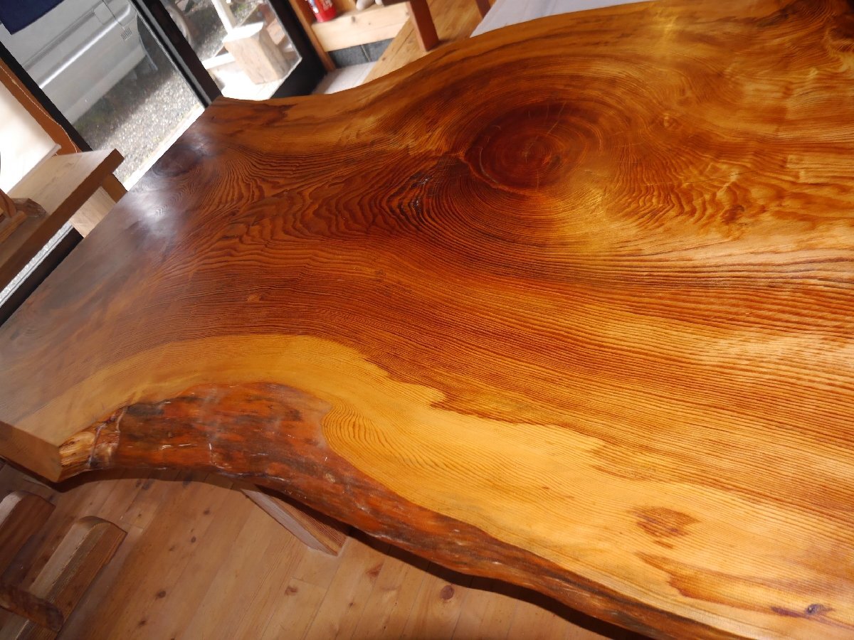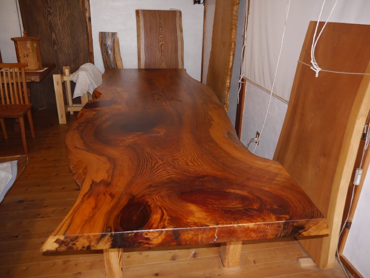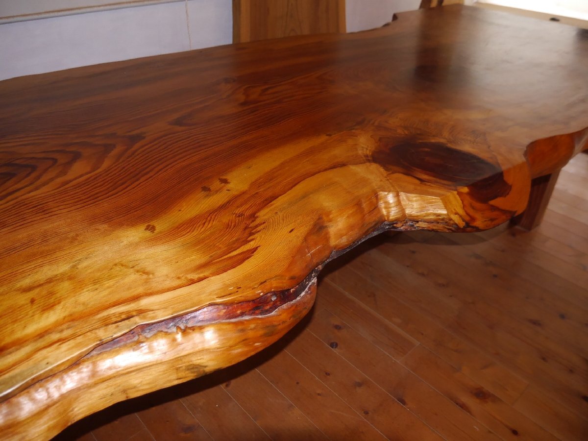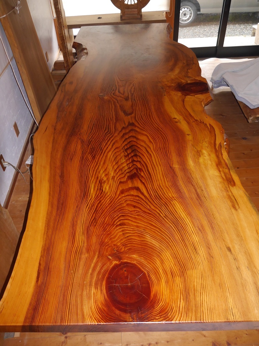 愛知県天然記念物、吉良町勝楽寺に植えられていた、足利誓いの松の3番玉の板に当たり、樹齢は660年と言われています。サイズ 長さ 318センチ 幅 102~110~100センチ 厚さ 65~80ミリ 高さ70センチ 脚もこだわり、マツで製作しました。天然オイルで仕上げて有ります。大きくて、重たい板なので搬入経路を確認して、お買い求め下さい。工房の自家運搬を予定しております。10人用 脚をカットして、座卓にも出来ますので、料理屋さんに、いかがでしょうか。この三河の黒松は、愛知県吉良町の勝楽寺の創建時に、足利尊氏が国家安泰、民福多幸を祈願して植えたとされ、地元では、足利誓いの松(樹齢660年)と、言われて来た物です。この木は、下から8mまで、節が少なかったため、突板用に長いまま運び出され、それより上の残り3mと少しの物が、テーブル用として製材されたと聞いている、数少ない貴重な物です。先日、この板と、同じ形をして、節も同じ所に有る物(兄弟)が、ユーチューブに映っていましたので、板のイメージなどを、ご覧ください。特別、大きくて重い板なので、搬入経路を慎重に、ご確認して下さい。一枚板は、自然が作り出した物物なので、実物をご確認する事をおすすめしています。なお、作業場に併設した店舗でも販売していますので、品切れの際は何卒ご容赦ください。