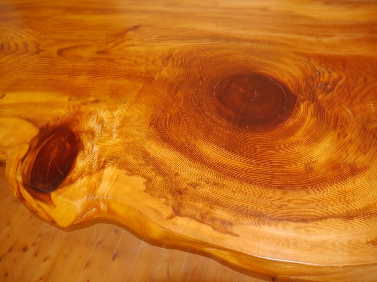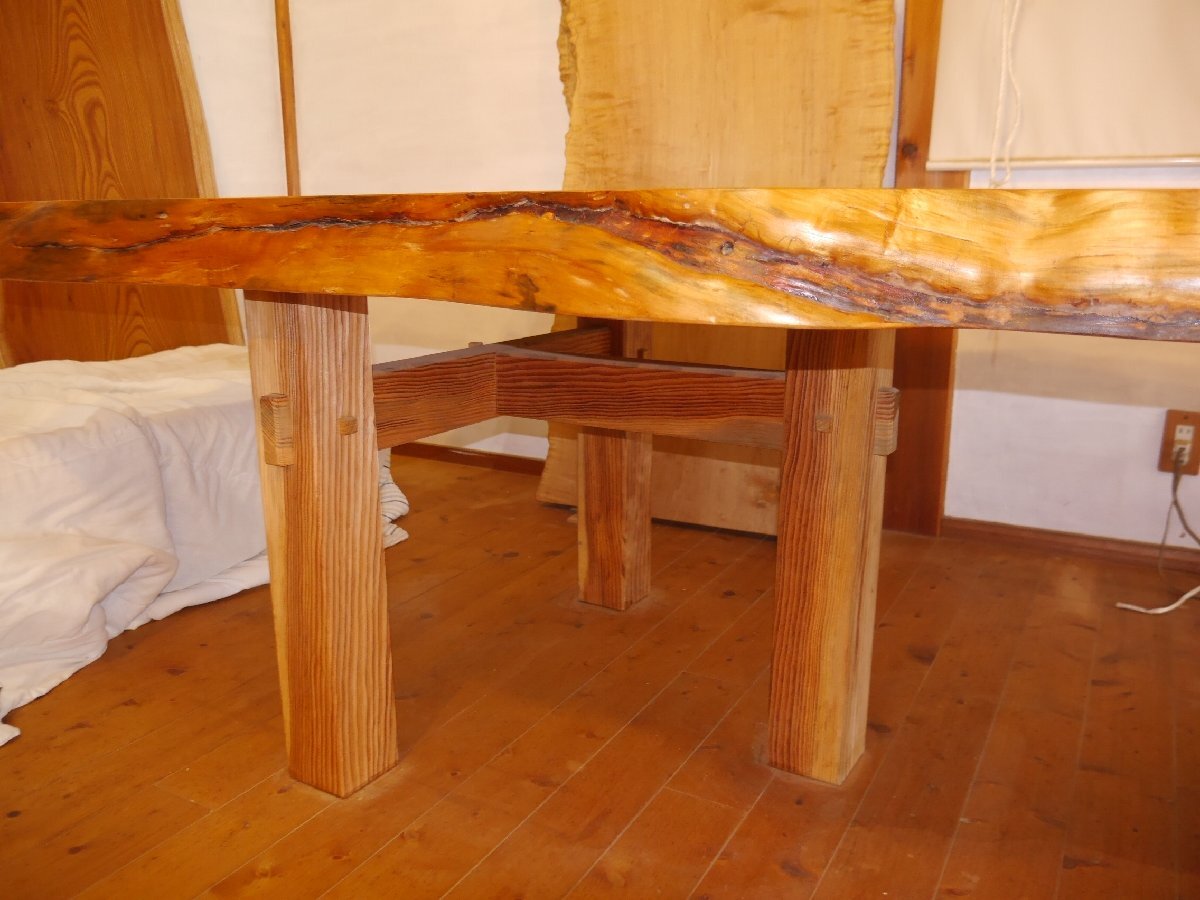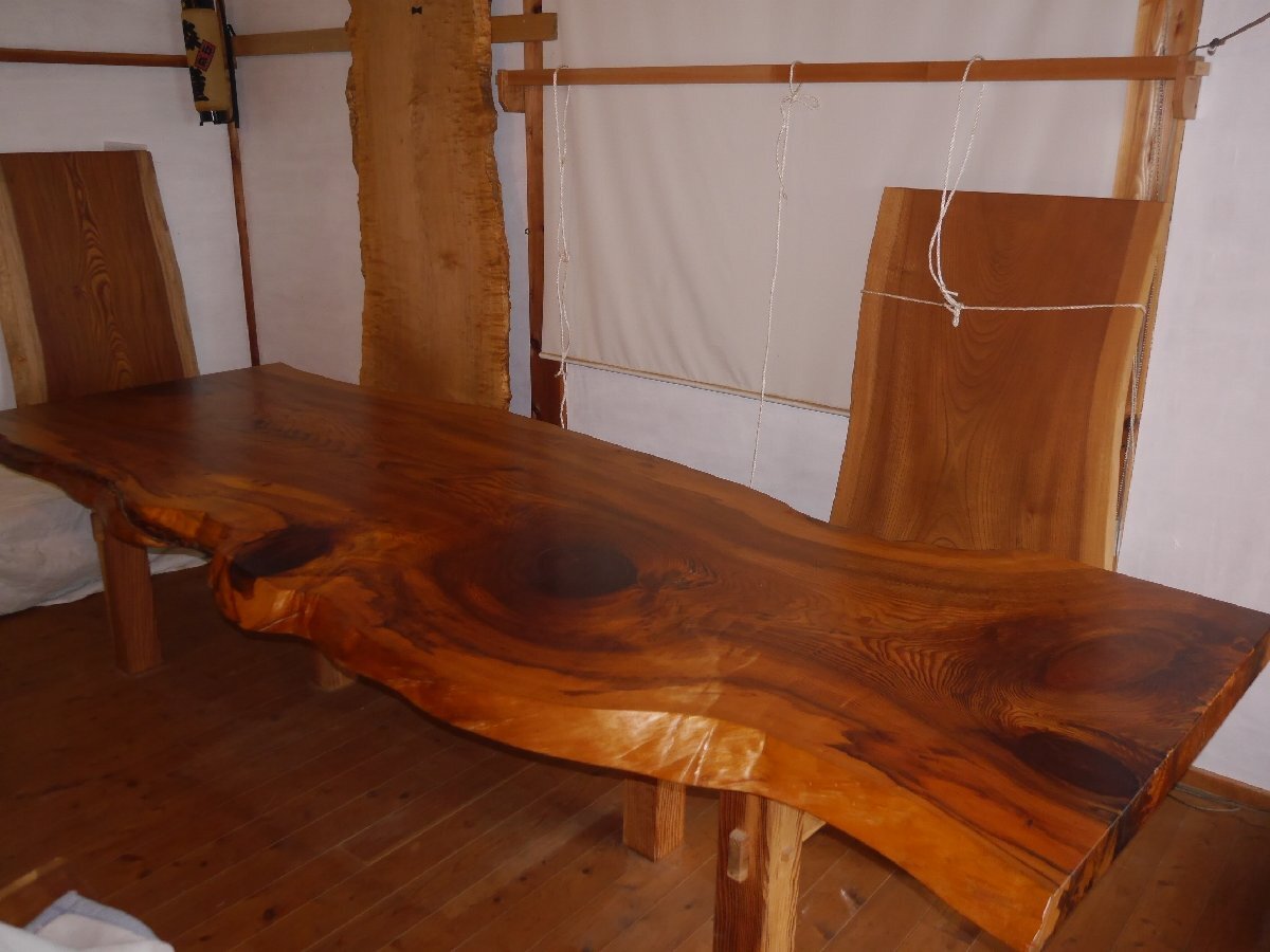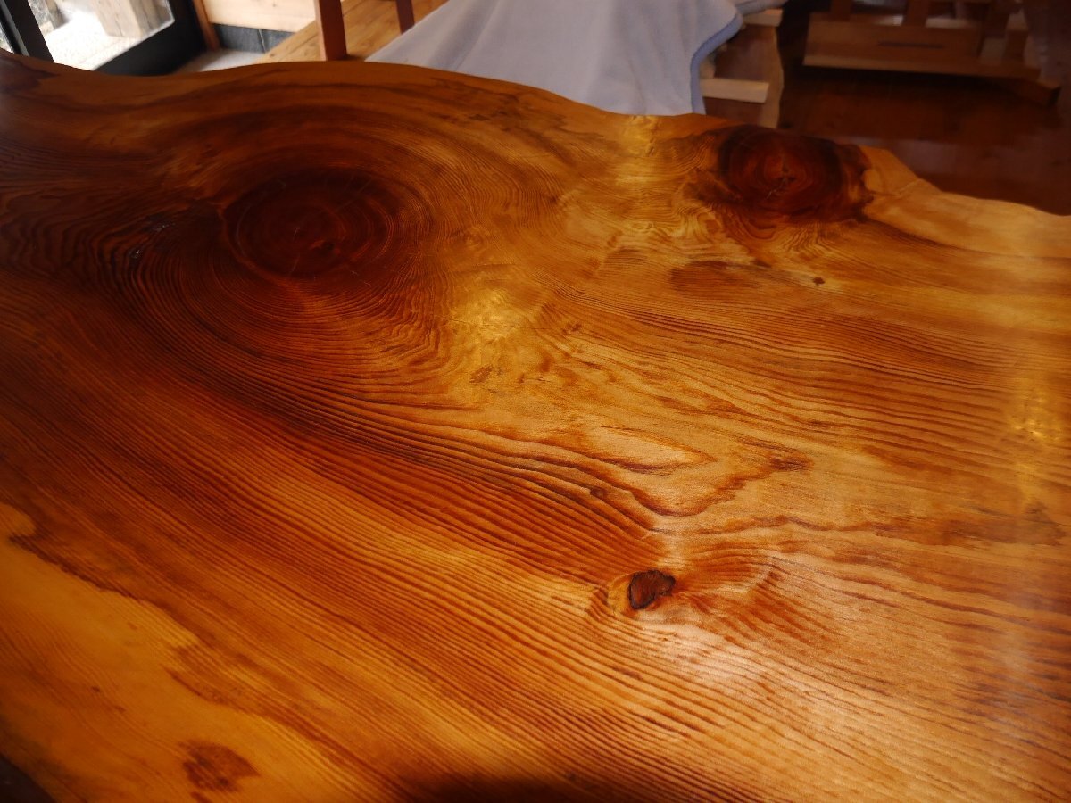 愛知県天然記念物、吉良町勝楽寺に植えられていた、足利誓いの松の3番玉の板に当たり、樹齢は660年と言われています。サイズ 長さ 318センチ 幅 102~110~100センチ 厚さ 65~80ミリ 高さ70センチ 脚もこだわり、マツで製作しました。天然オイルで仕上げて有ります。大きくて、重たい板なので搬入経路を確認して、お買い求め下さい。工房の自家運搬を予定しております。10人用 脚をカットして、座卓にも出来ますので、料理屋さんに、いかがでしょうか。この三河の黒松は、愛知県吉良町の勝楽寺の創建時に、足利尊氏が国家安泰、民福多幸を祈願して植えたとされ、地元では、足利誓いの松(樹齢660年)と、言われて来た物です。この木は、下から8mまで、節が少なかったため、突板用に長いまま運び出され、それより上の残り3mと少しの物が、テーブル用として製材されたと聞いている、数少ない貴重な物です。先日、この板と、同じ形をして、節も同じ所に有る物(兄弟)が、ユーチューブに映っていましたので、板のイメージなどを、ご覧ください。特別、大きくて重い板なので、搬入経路を慎重に、ご確認して下さい。一枚板は、自然が作り出した物物なので、実物をご確認する事をおすすめしています。なお、作業場に併設した店舗でも販売していますので、品切れの際は何卒ご容赦ください。