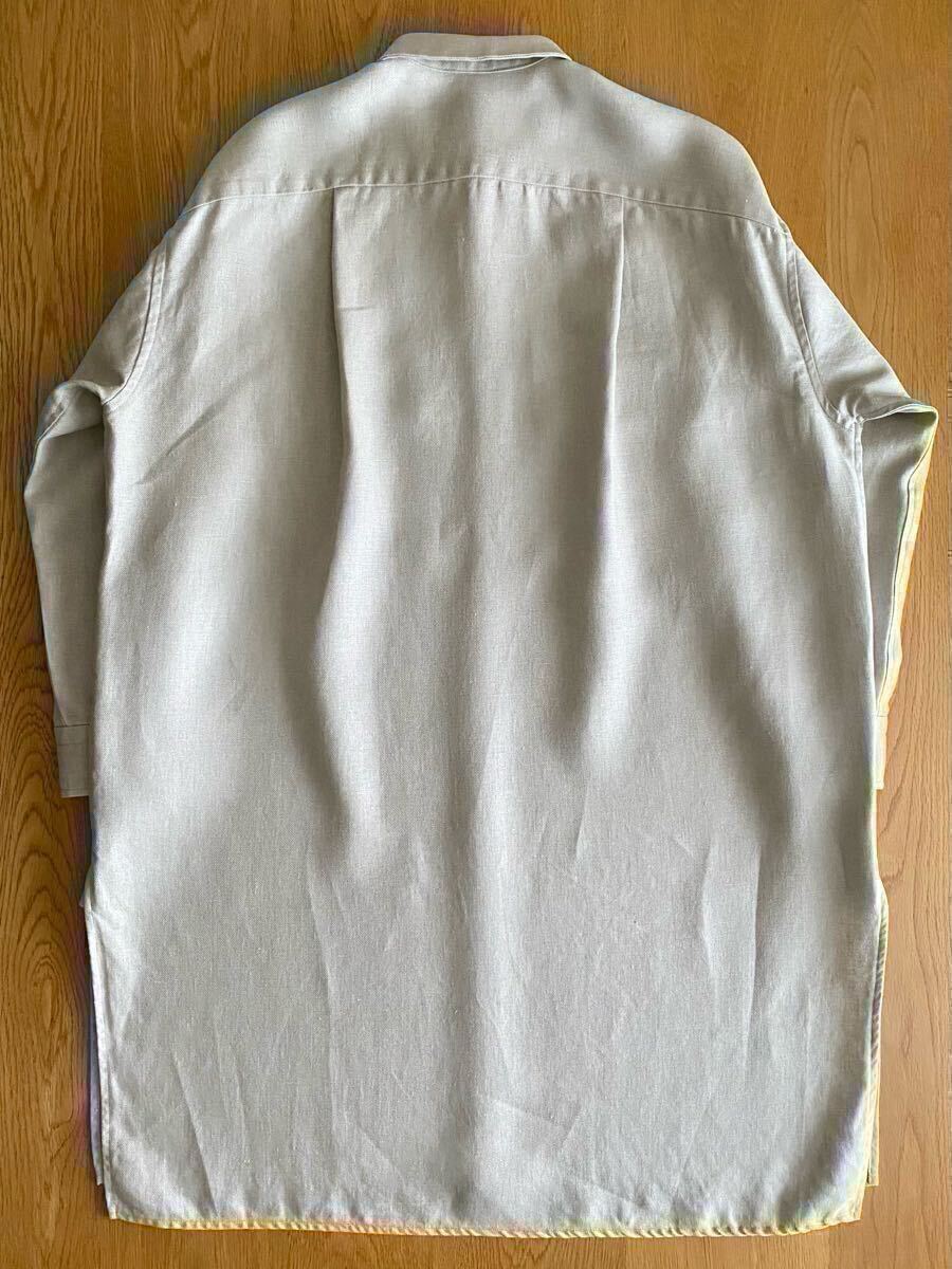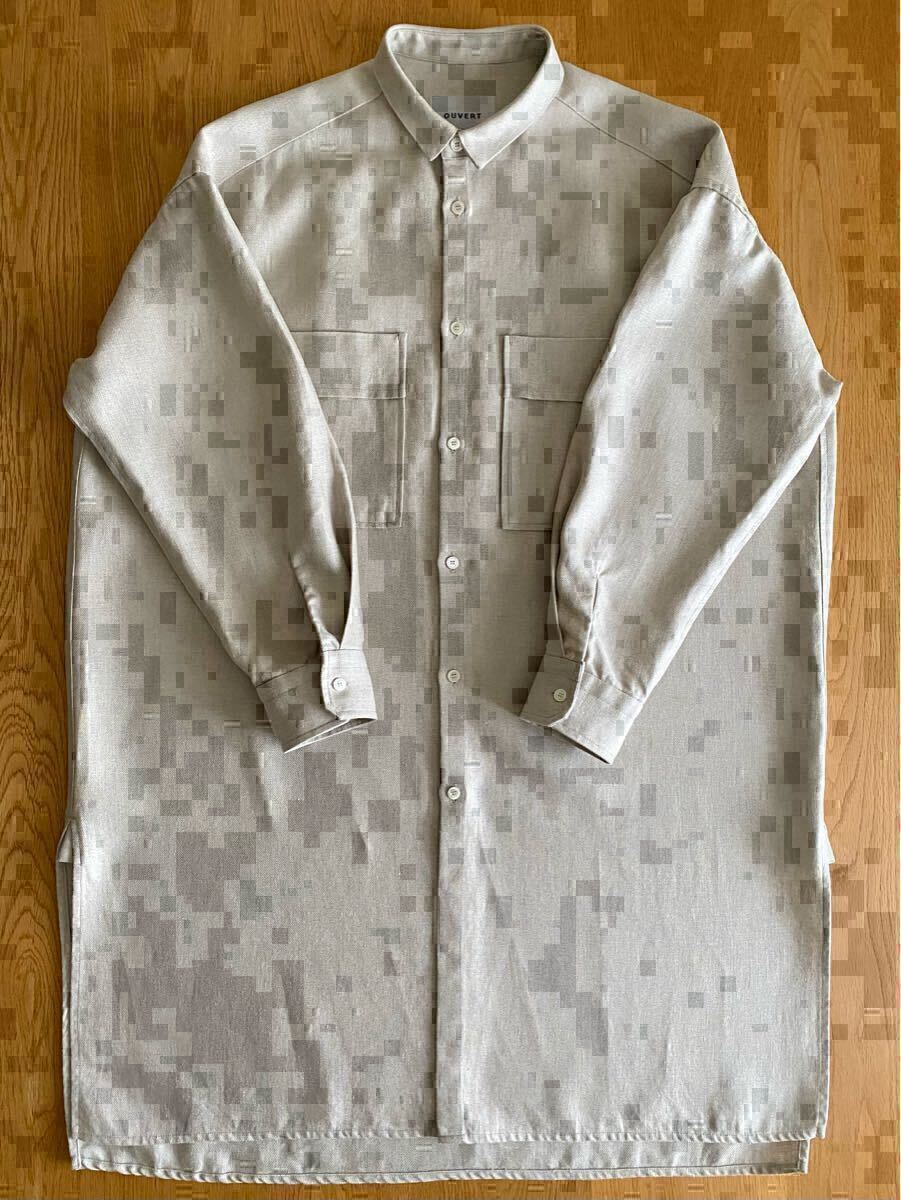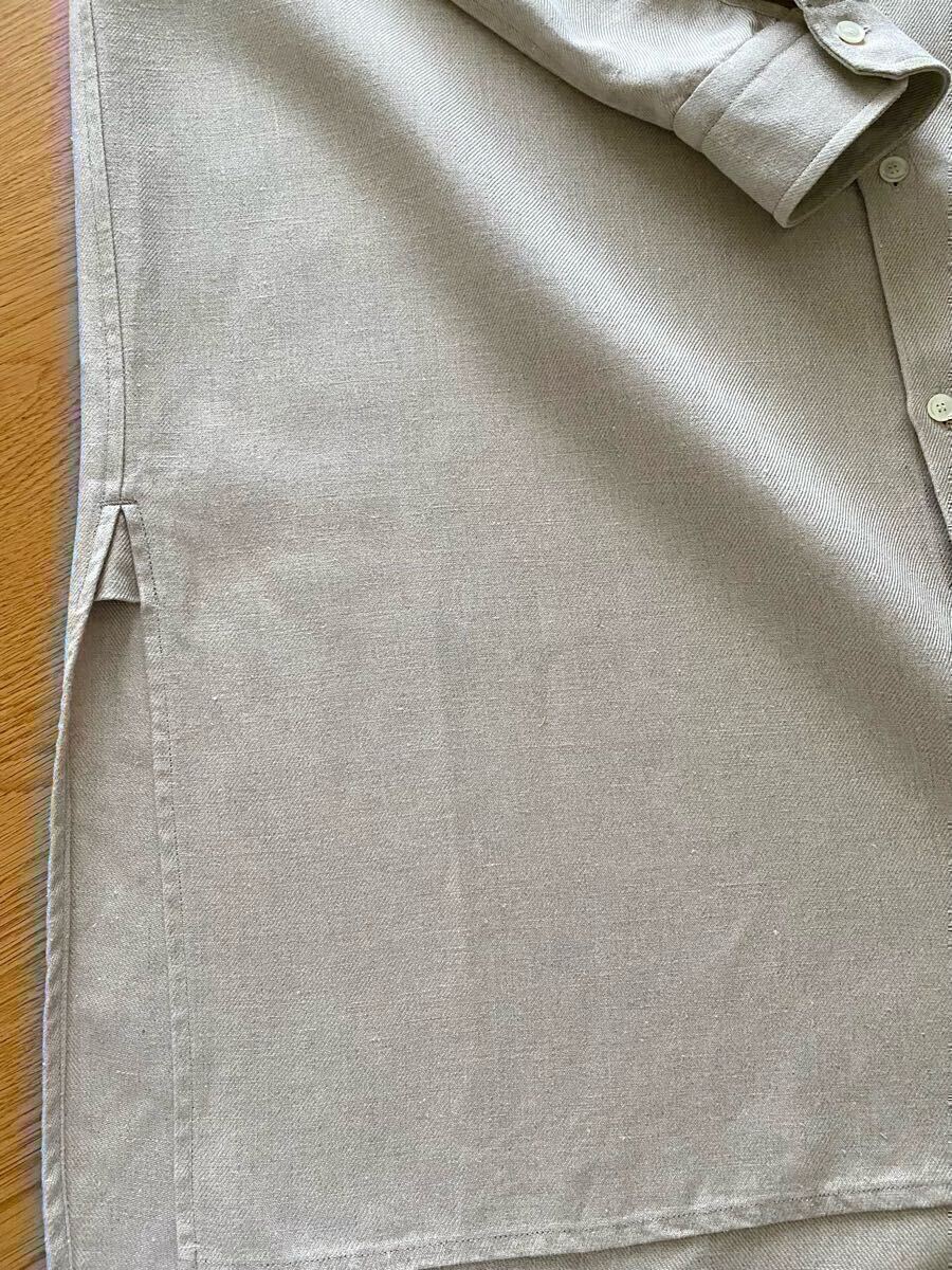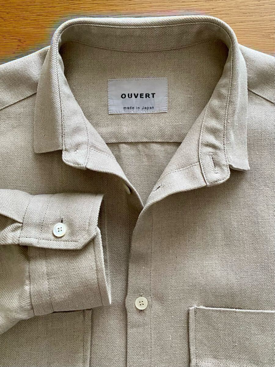 OUVERTのロングシャツです。中厚手の綾織リネン100%生地で色はナチュラルベージュ。ドロップショルダーのゆったりしたシルエットに小振りな襟、両胸ポケット、裾脇スリット、袖口はボタン留めです。チュニックとして着たり、ジャケット代わりや羽織りとして、これからの季節に活躍すると思います。