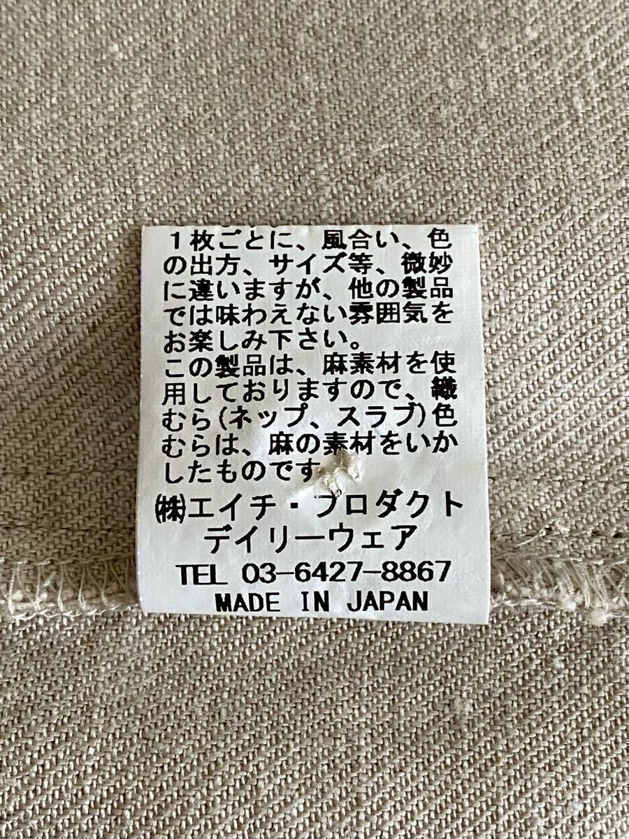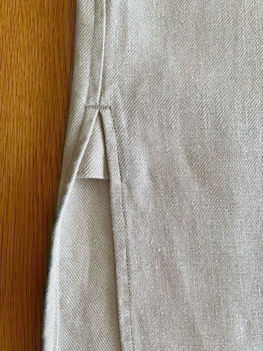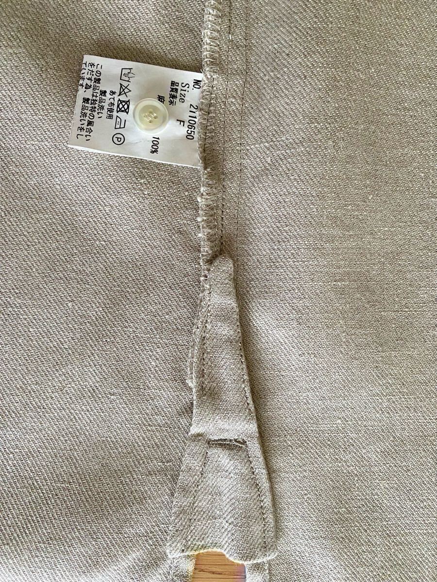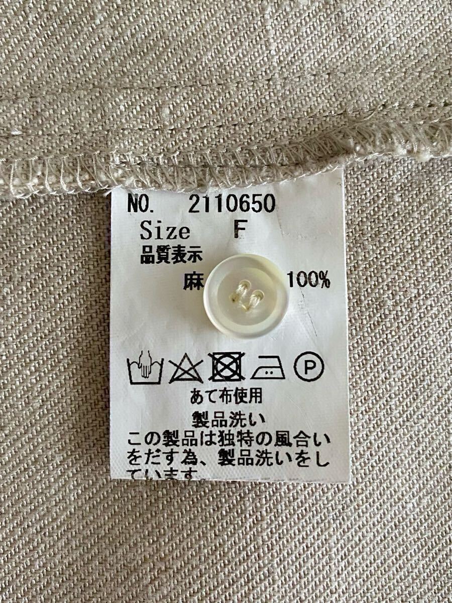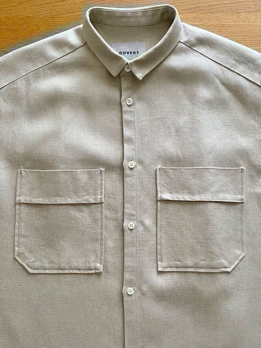 OUVERTのロングシャツです。中厚手の綾織リネン100%生地で色はナチュラルベージュ。ドロップショルダーのゆったりしたシルエットに小振りな襟、両胸ポケット、裾脇スリット、袖口はボタン留めです。チュニックとして着たり、ジャケット代わりや羽織りとして、これからの季節に活躍すると思います。