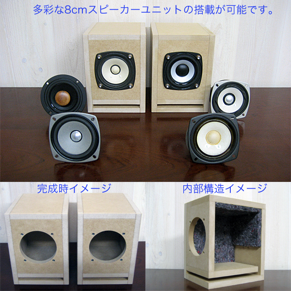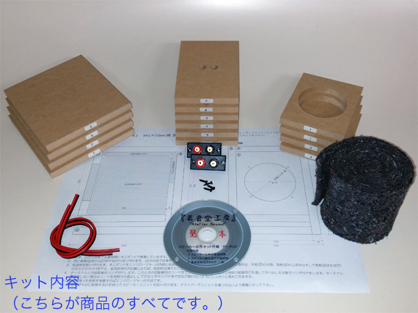 ご覧いただきありがとうございます。 8㎝フルレンジスピーカーユニット用に、故・長岡鉄男氏が設計された小型のバスレフタイプ、ブックシェルフ型スピーカー『BS-8』のカット済み自作用キット(2本1組)です。 長岡氏による設計のユニット取り付け用の開口径を見直し、より多くの8cmユニットが取り付けられる汎用性の向上を図ったオリジナル設計になっております。 ※ご注意! この商品は後述のオプションパーツも含んだキット構成になっております。オプションパーツが不要な方は、別途出品しております「オプション無し」キットへの入札をお願いいたします。 スピーカーの自作にご興味のある方、いかがでしょうか? 自作スピーカーとしては最も簡単なタイプに属しますので、初心者の方でもそれほど苦労することなく製作できると思います。この機会に是非「自作」に挑戦してみてはいかがでしょうか? オリジナルの設計では厚さ14mmのラワン材の無垢板(棚板用材)によるものですが、この品物は厚さ12mmのMDFを使用しております。板材の厚みは薄くなっていますが、強度や比重はオリジナルのものより大きいため、品質で劣ることはありません。また、板の反りや割れに泣かされることもありませんし、材の品質が均一なため左右の箱で音が違うなどということも起こらず、余計な箱鳴りがない素直な音質が得られます。 完成時の寸法はW124mm×H169mm×D143mmと大変コンパクトですが、近年の8cmスピーカーユニットの基本性能の高さと相まって卓上用として使用すれば想像以上の素晴らしい音を奏でてくれます。 キットの内容はカット済み合板×一式(部材①から⑦まで各2枚ずつの14枚)で、バッフル板(前板)にはφ76mmの丸穴およびスピーカーユニット固定用ビスの下穴加工(対角ピッチ85mm)を施してあります。 これにより各社多くの8cmユニットの搭載が可能になっております。 <搭載可能ユニットの例> Fostex FE83NV、FF85WK(旧機種FE83En、FE83E、FE87E、FF85K、FE83、FE87等) TangBand W3シリーズ(ペーパーコーン、メタルコーン、PPコーン各種/一部不可あり) DIY AUDIO SA/F80AMG(マグネシウムコーン) beyma 3FR30、3FR30Nd Visaton FR8-8、FR8JS-8 さらに、下記のスピーカーターミナル、吸音材、内部配線コード等も同梱してあります。 オプションセットの内容は下記のとおりです。(写真2枚目参照) 1. スピーカーターミナル:ART TS-177 2個1組(バナナプラグ対応) 2. 吸音材:ニードルフェルト 12cm×90cm(厚さ10mm) 1枚 3. 内部配線用コード:0.75sq 30cm 2本 4. ターミナル(TS-177)に対応する取り付け用の穴加工(背板) また、キット本体以外の付属品として原寸図面(A3版)とデータCD-ROMを添付いたします。 データCD-ROMには写真を多用した組立工程解説書や『スピーカー工作の基礎知識』と題した工作法の解説書等をPDFファイルにて収録してありますので、初心者の方には大変参考になると思います。 ご注意! この商品にはスピーカーユニットは付属しておりません。ユニットは落札者様にて別途ご用意下さい。 キット販売ですので、製作に関するサポートはできませんので、落札者様の責任において製作して下さい。また、基本的にノークレーム、ノーリターンとさせていただきますので併せてご了承下さい。 | ||