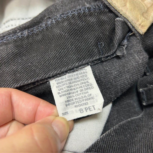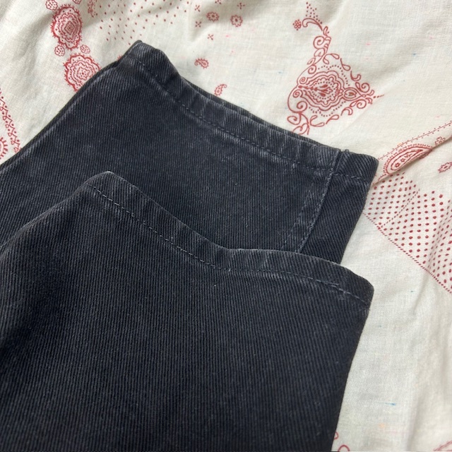 ●商品説明・・・アメリカ古着になります。80年代~90年代初め頃のオールド・ヴィンテージの Lee ブラックデニムパンツです。糸からの先染めではなく、生地を染めてから制作(カット・縫製)したサルファブラック染め(オールドのブラックデニムの分類的には後染め)で、先染めのブラックデニムよりもアタリや色落ちの濃淡が出やすいメリハリのある色落ちのするタイプになります。サイズ表記的におそらくレディース物で、メンズに比べゆったり大きめなお尻周り・ワイドな太股から、裾にかけてしっかりテーパードしたオールドスクールやストリート感のある面白いシルエット感です。made in USA (アメリカ製)でユニオンチケットのスタンプ付きです。オールド物のしっかりしたデニム生地で、昔ながらの風合いのよいデニム生地の一着です。USA 8で、今のM~やや小さめL程度のサイズ感かと思います。