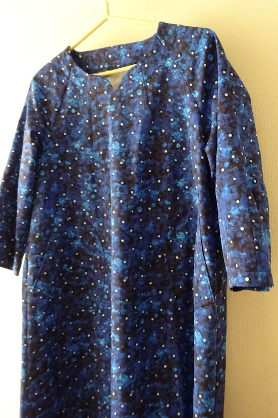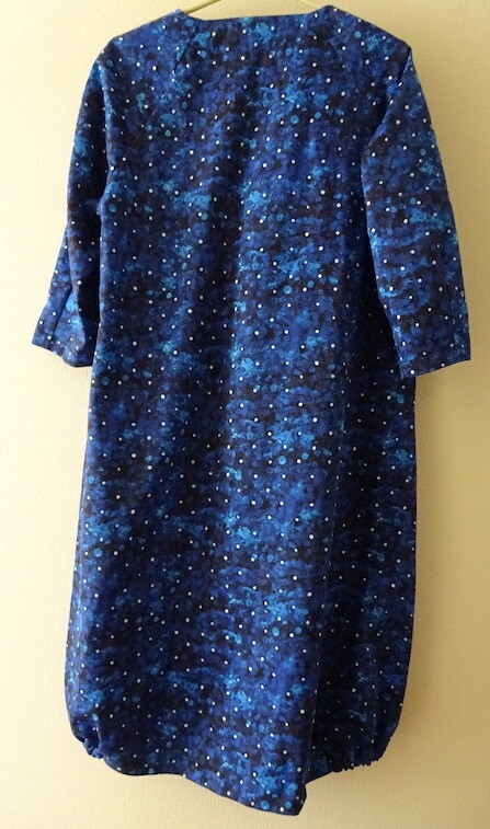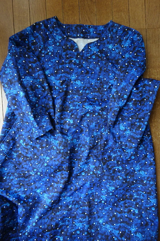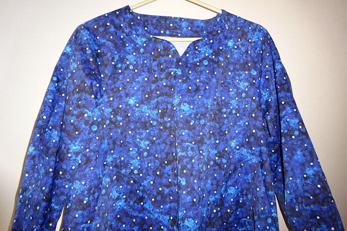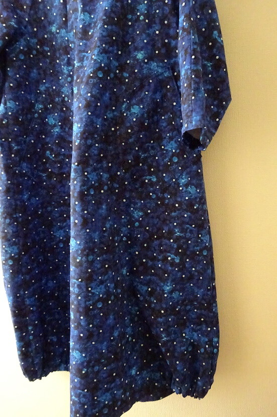 ラグラン袖で六分から七分くらい。体のラインを取らないデザインで、とても楽ちんです。