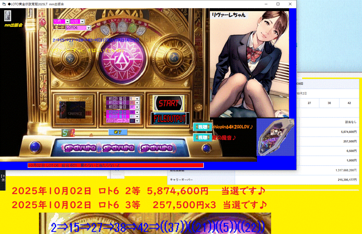 2025年10月02日  ロト6 3等    257,500円x3  当選です♪