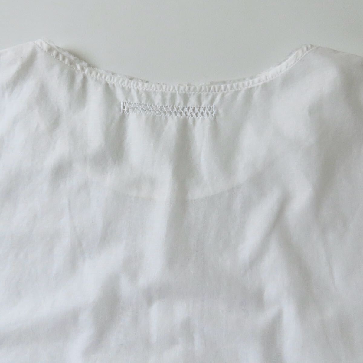 襟元は断ち切り風で、フロントや袖などにポイントでレース編みが施されています。