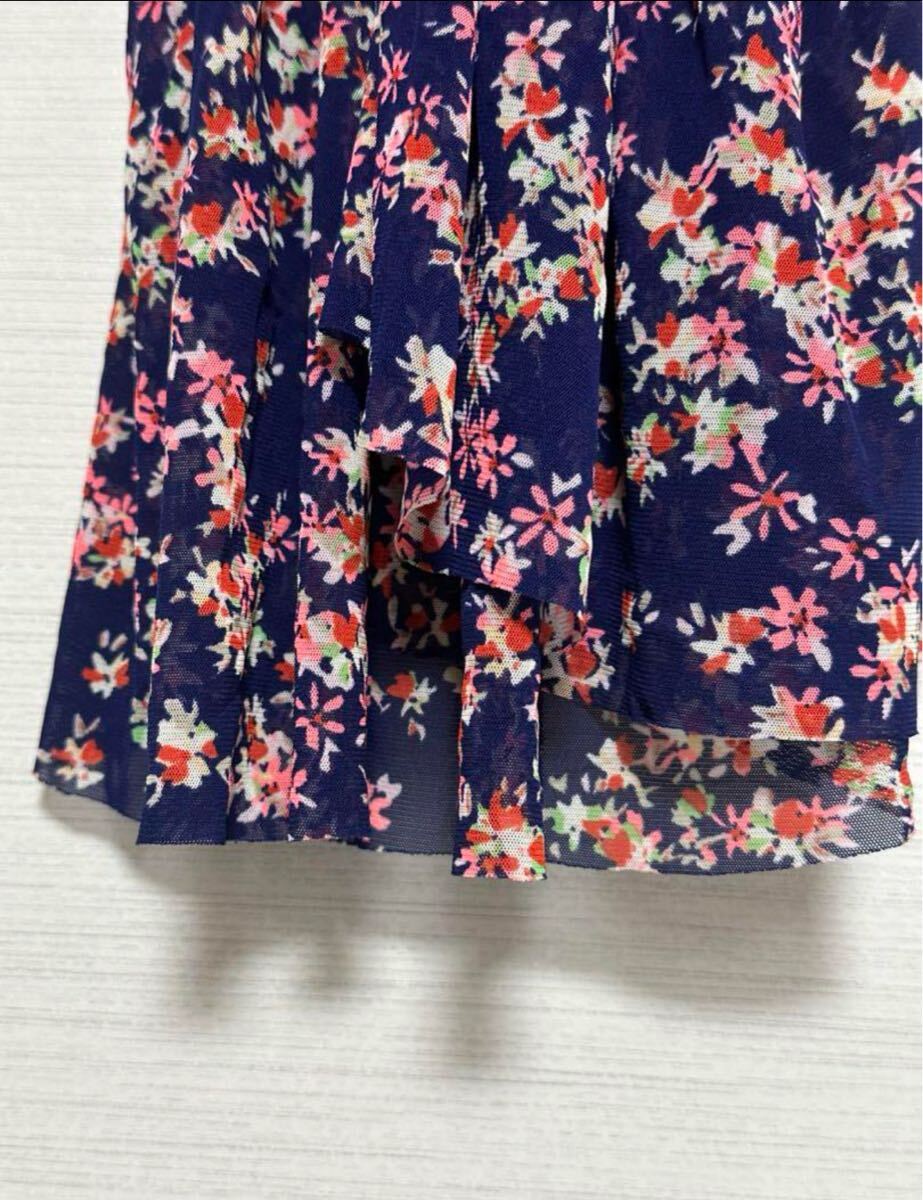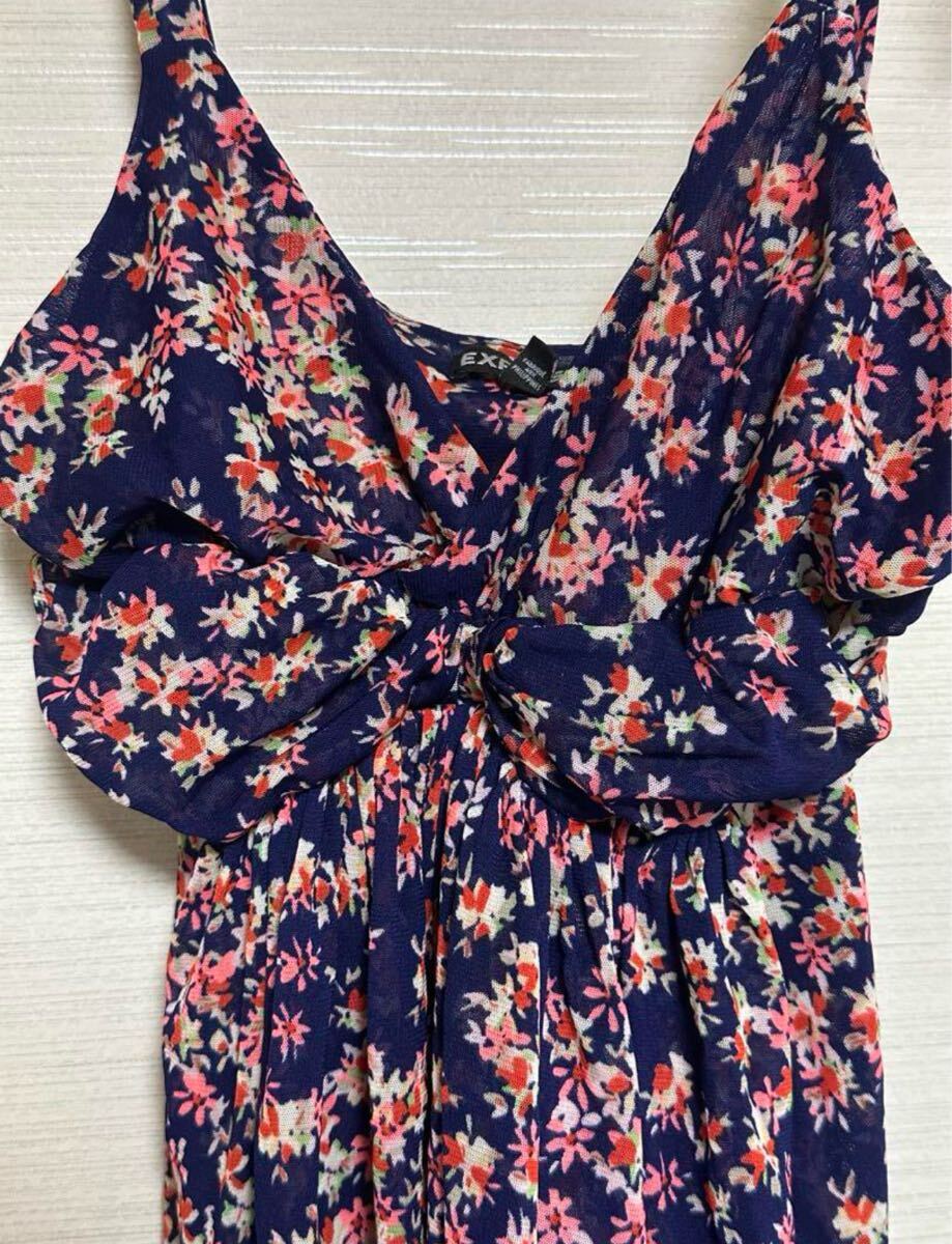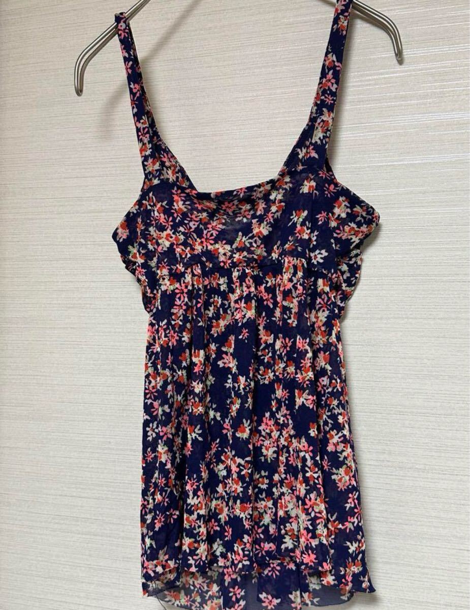 レトロで可愛い花柄キャミソールです。サラッとした透け感のあるシフォン素材で、暑い季節にぴったりの軽やかさ。胸元のツイストデザインと、裾に向かって広がるシルエットが女性らしさを引き立ててくれます。ネイビーベースに小花柄が散りばめられており、甘すぎず大人っぽく着こなせるのが魅力。デニムやシンプルなスカートと合わせるだけでお洒落。