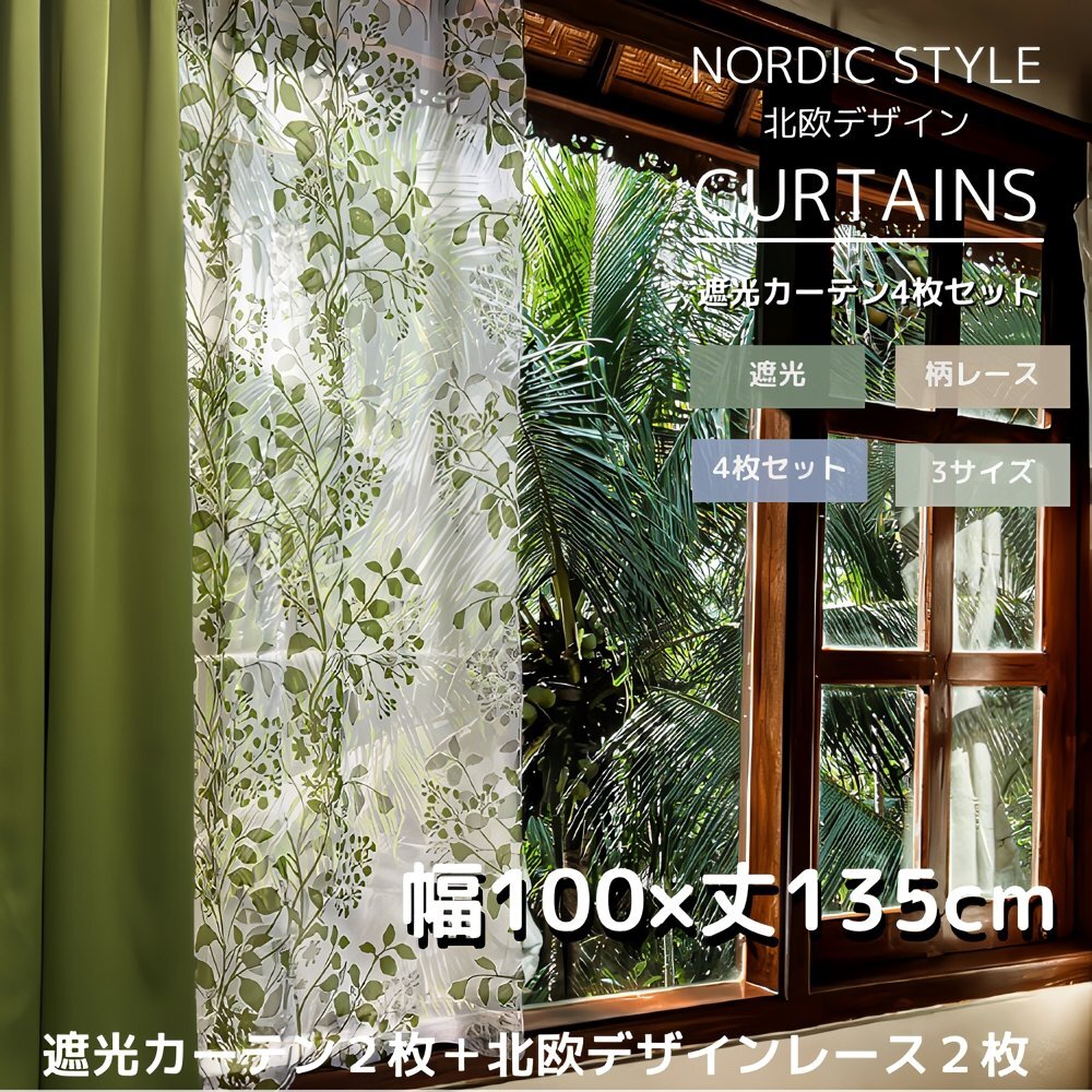 | こちらはCリーフ/グリーン 丈135cmの購入ページになります。 遮光厚地2枚+北欧風レース2枚の 合計4枚セットカーテン | ||||