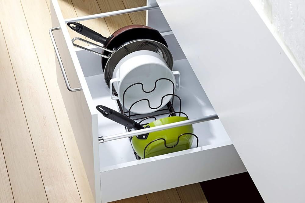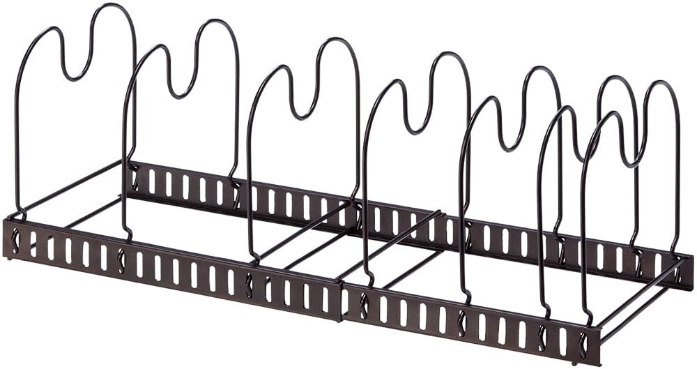 滑り止めも付属しているのて安定して使えます。 幅の微調整が出来るので便利です。 安定感がありぐらつき、がたつきがありません。 キッチンがスッキリ片づきます 収納量に合わせて調整可能な、伸縮式フライパンラック! 【特長】・お手持ちのフライパン/鍋/蓋などが整然と収納できます。 ・収納量に合わせてフレームの長さが調整可能! ・仕切り7本も自由に装着できます。 本体サイズ(約):幅330~570X奥190X175mm
