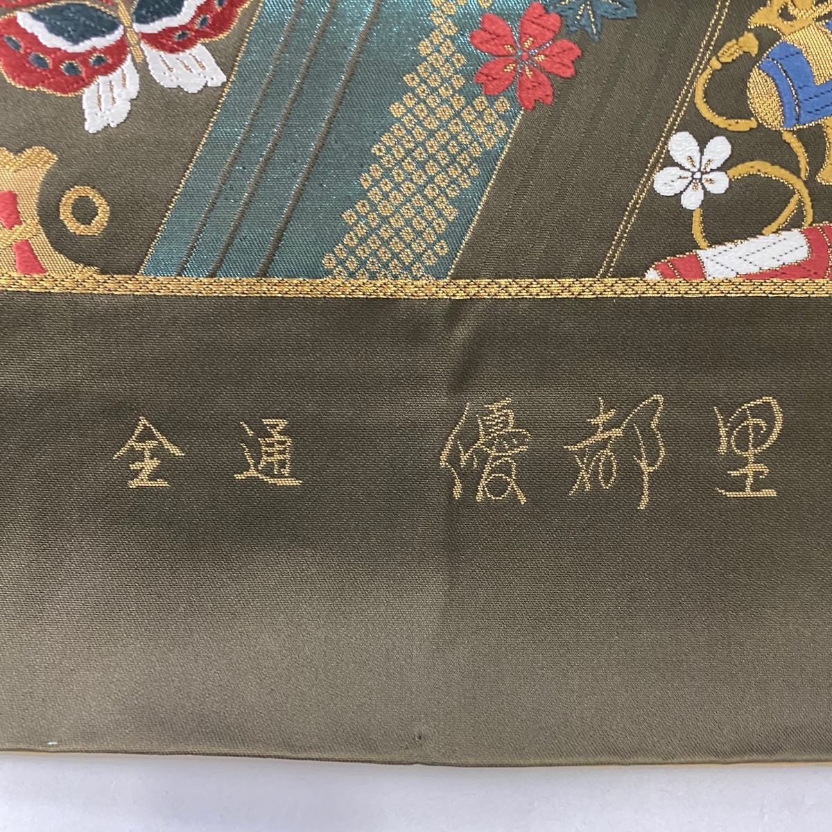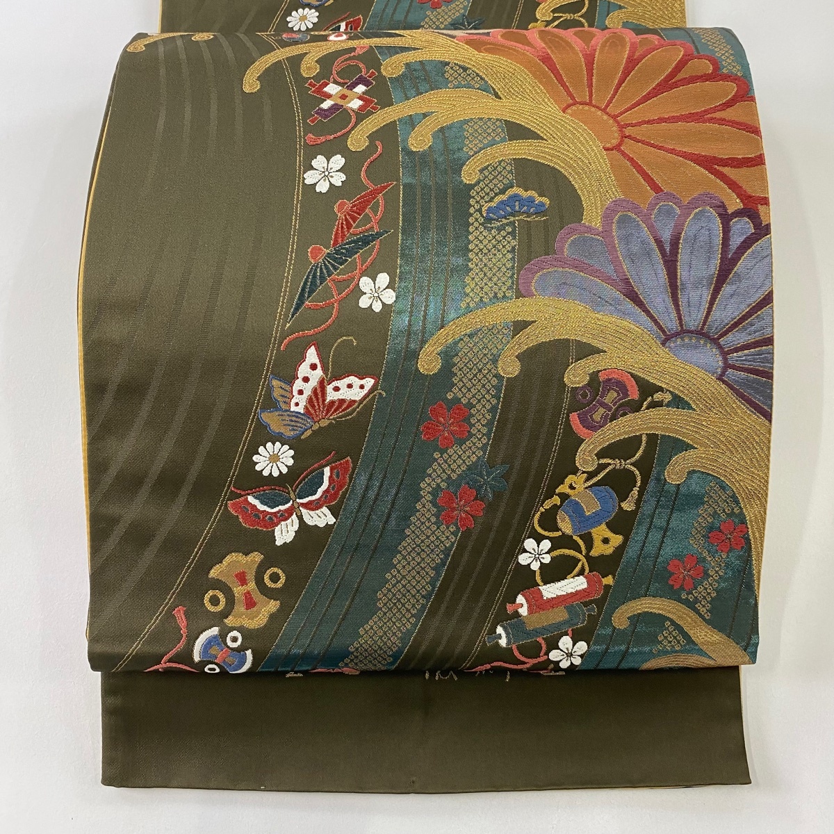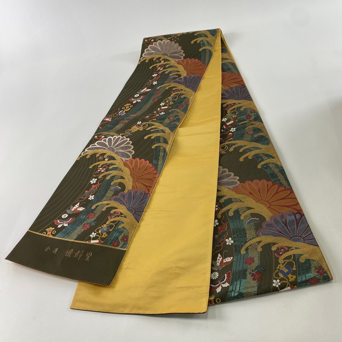 | 袋帯 美品 秀品 宝尽くし 波頭 金糸 箔 茶色 全通 正絹 【中古】 |