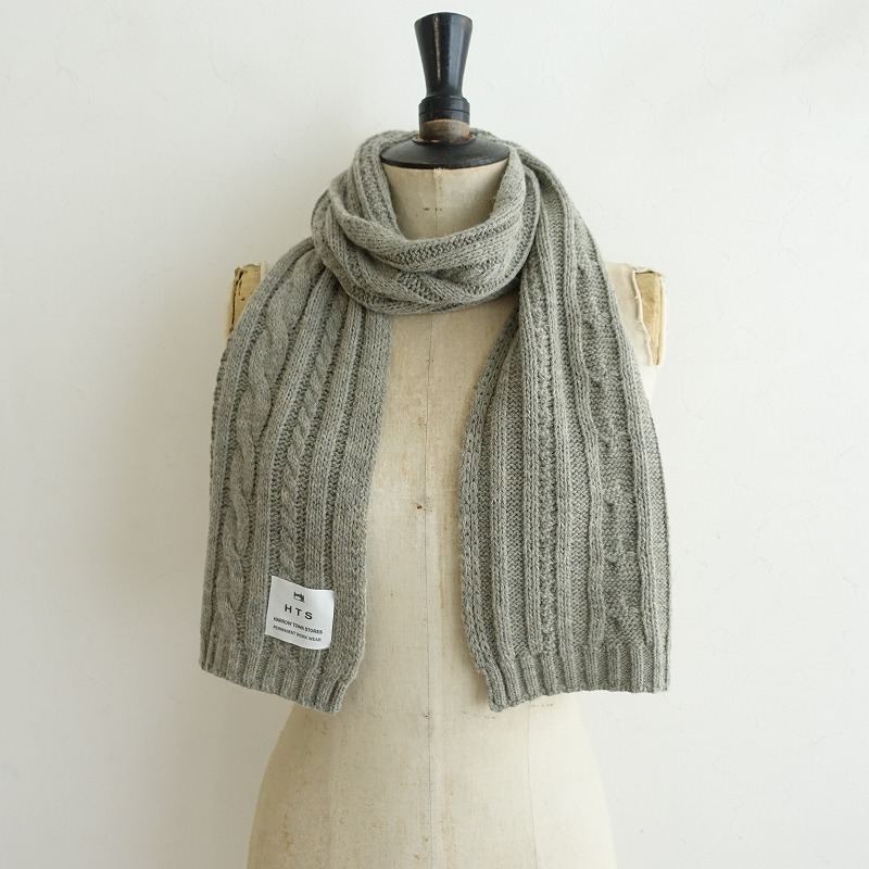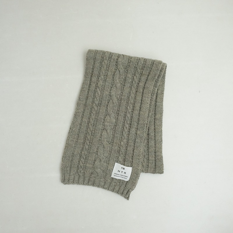 HARROW TOWN STORESのケーブルスカーフです。カラーはグレー系で、ケーブル編みのニット素材であしらわれています。 |