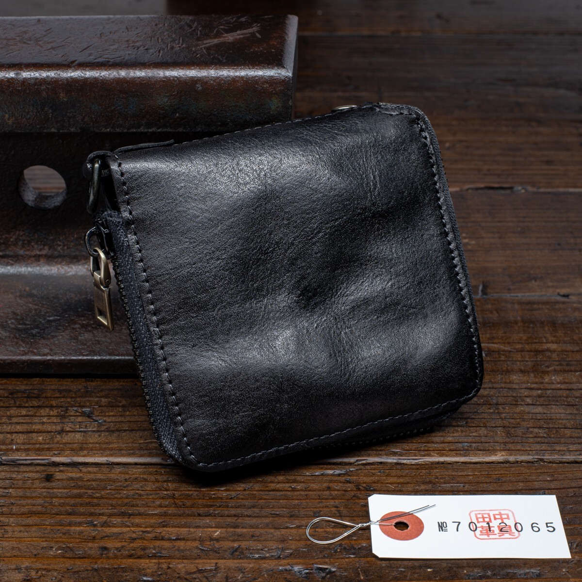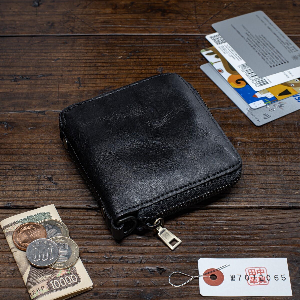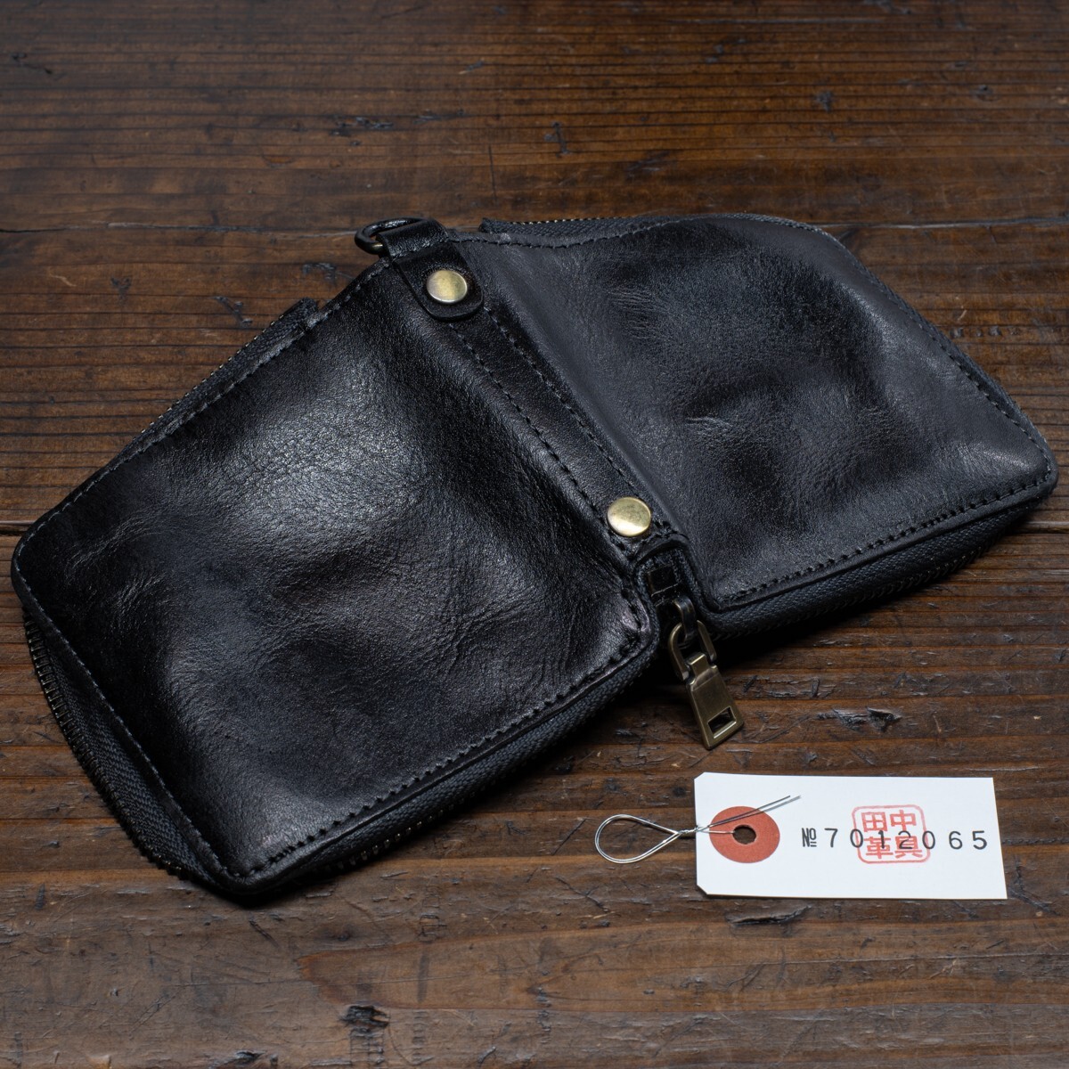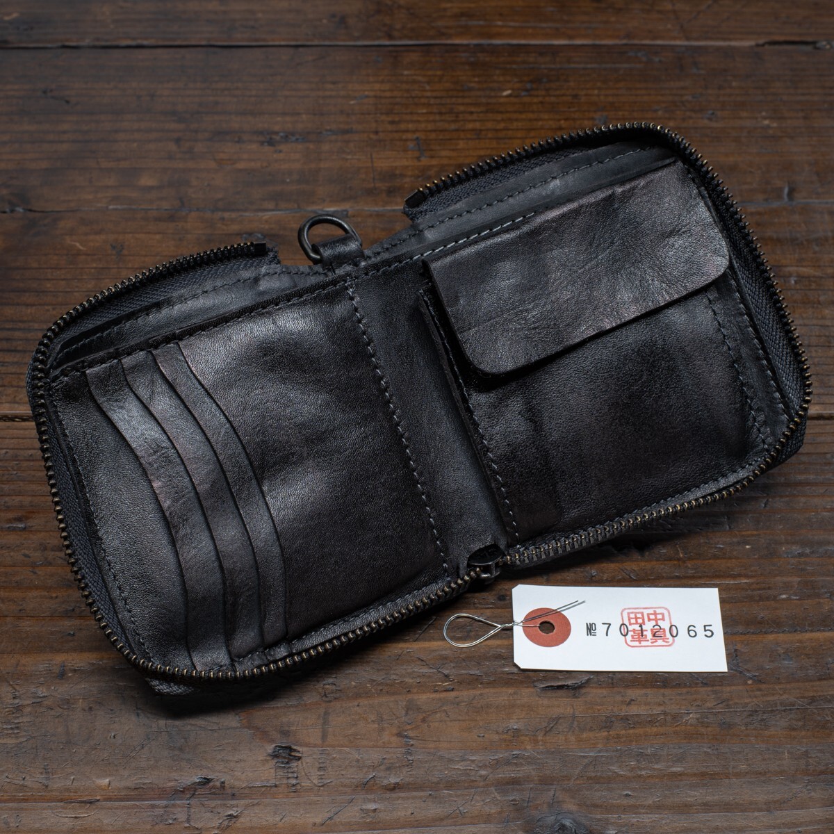 ウォッシュドレザー【牛革】ミドルウォレット ラウンドファスナー 二つ折り メンズ 本革 財布 新品 未使用 送料無料 1円 ブラック 田中革具