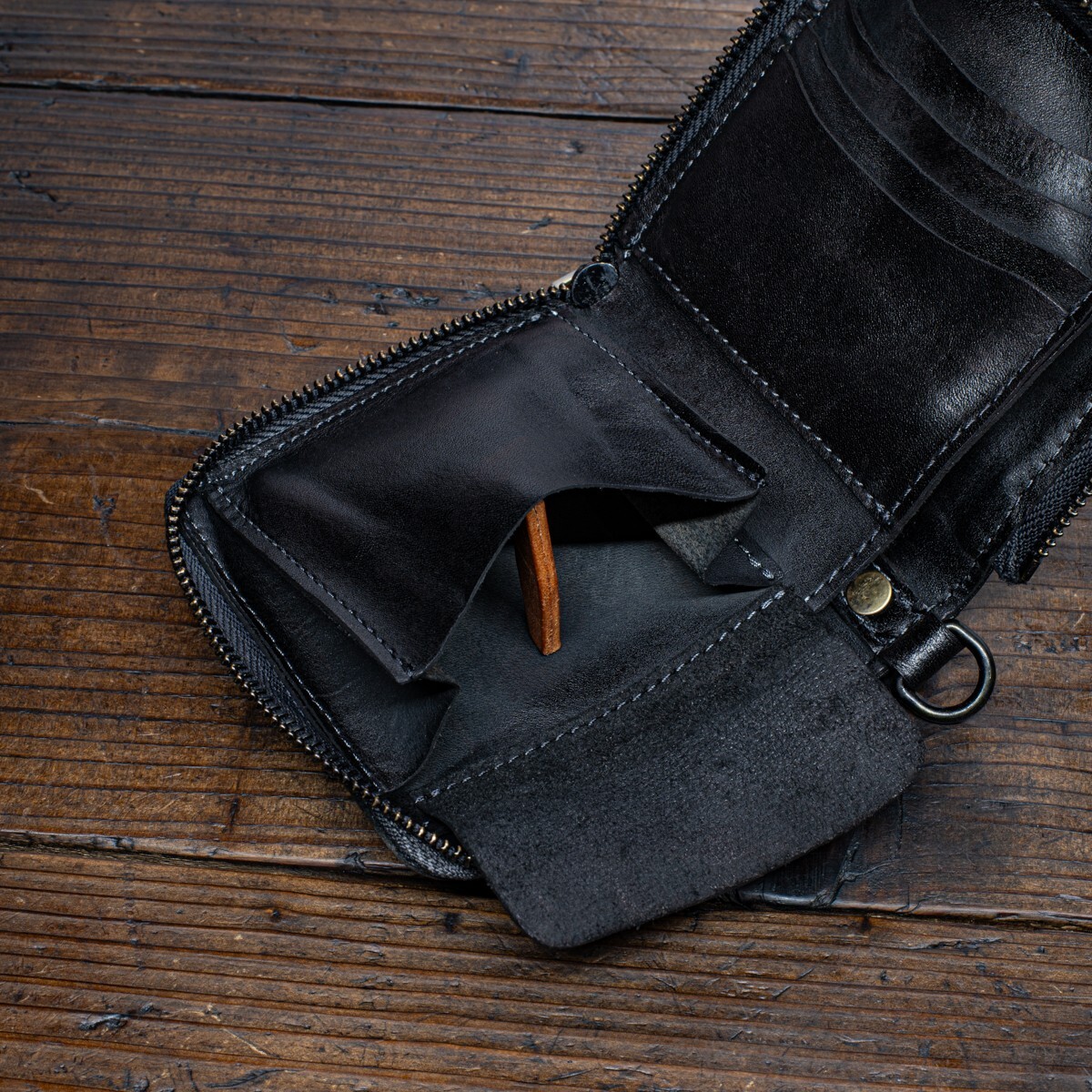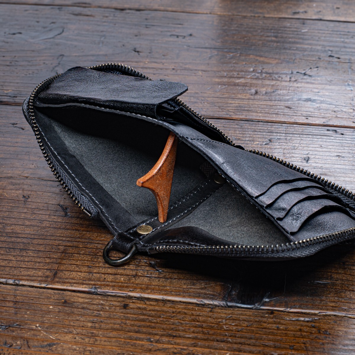 内装にも同じ革を使い、布などの裏地はあえて省いています。そのぶんかさばらず、丈夫でスリムな仕上がりです。収納は最低限にとどめたシンプルな構造で、余計なポケット類はありません。質実剛健な作りを好む方に向いています。