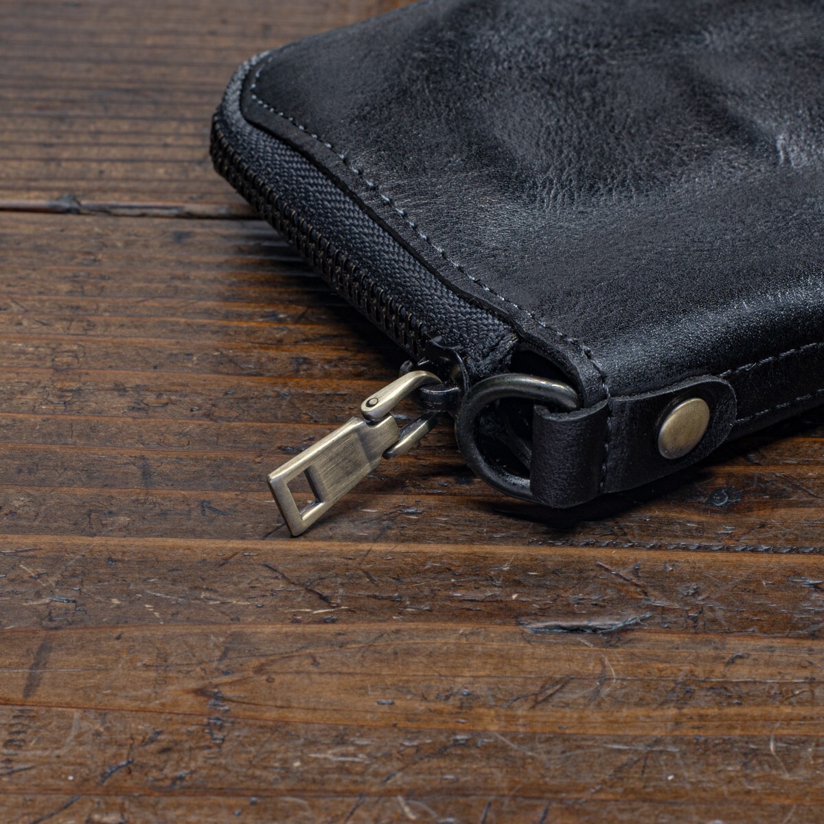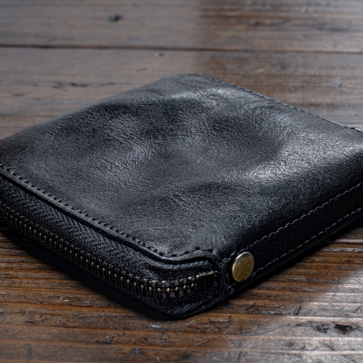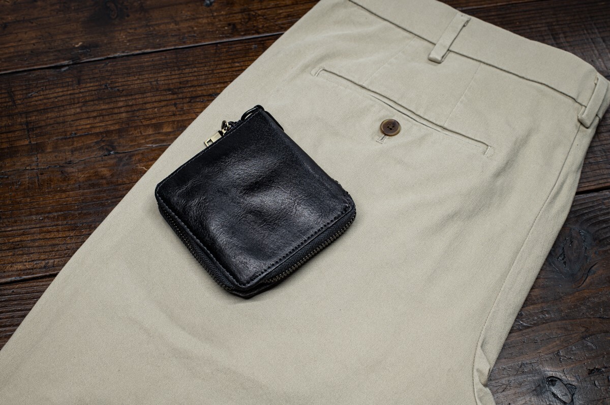 ウォッシュドレザーを使ったラウンドファスナーです。見た目に反して革質は柔らかく、サイズもコンパクトなので、ズボンの後ろポケットにすっぽり収まり、気軽に持ち歩けます。