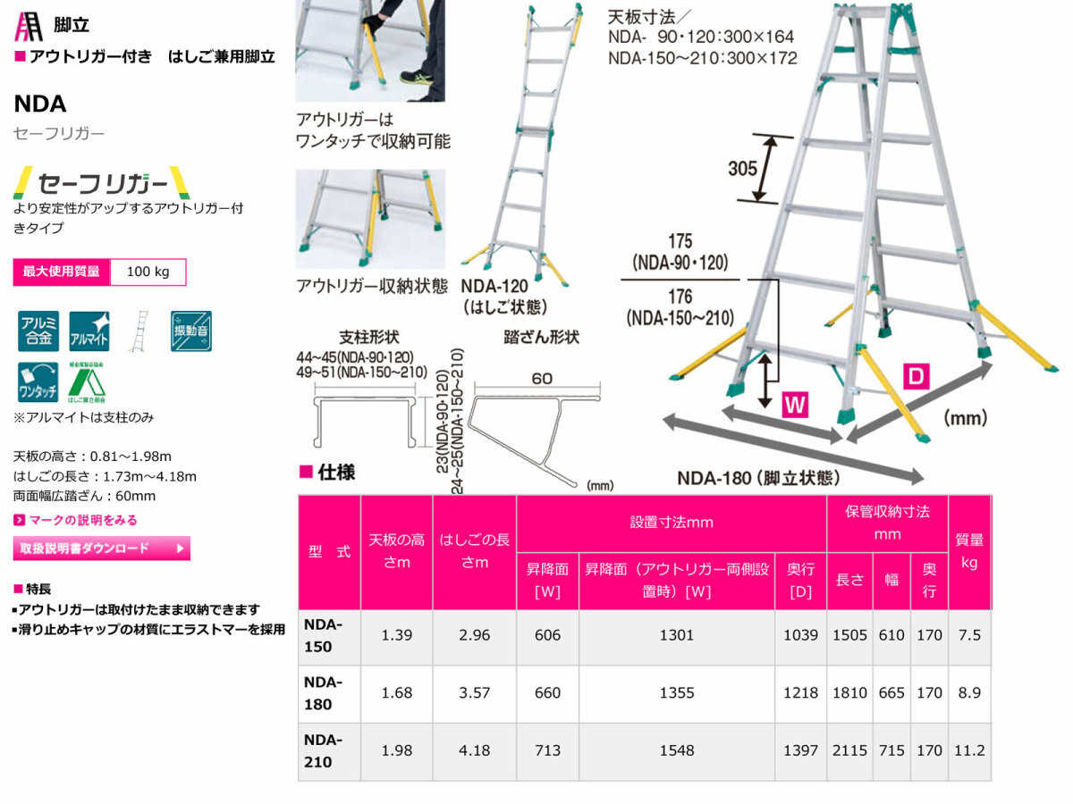 ピカ コーポレイション アウトリガー付き はしご兼用脚立 NDA-150 ※こちらの商品は、「代金引換」支払を ご利用いただけません。