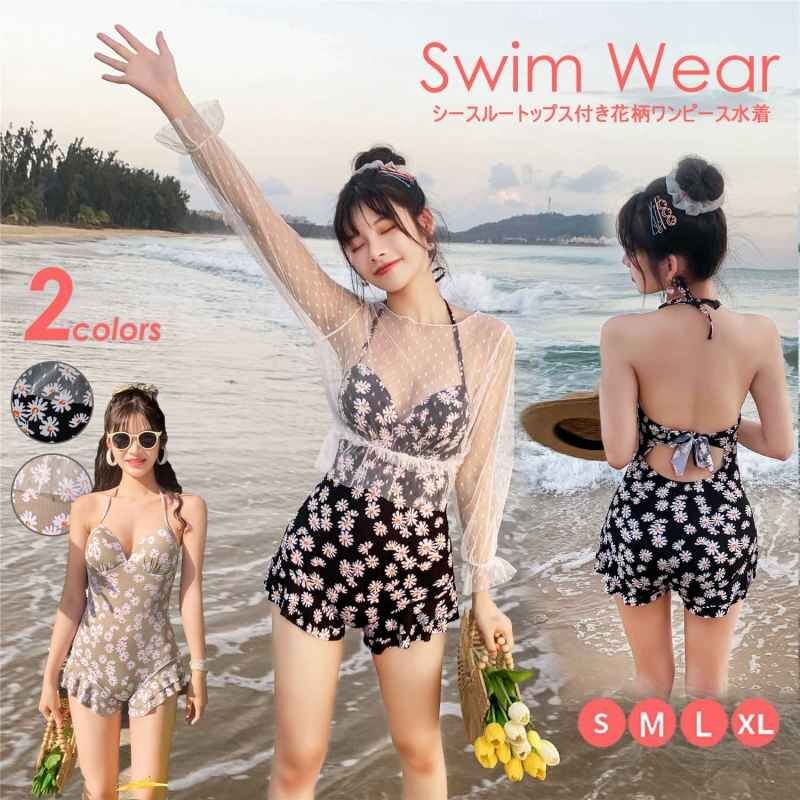 レディース ワンピース水着 シアー シースルートップス フリルパンツ 花柄 体型カバー 映え XL コーヒー