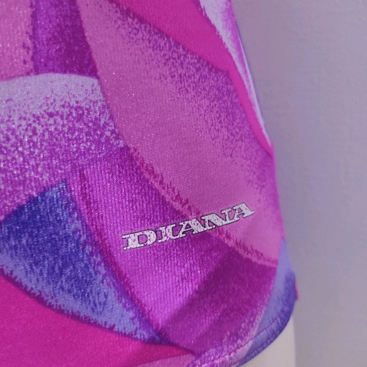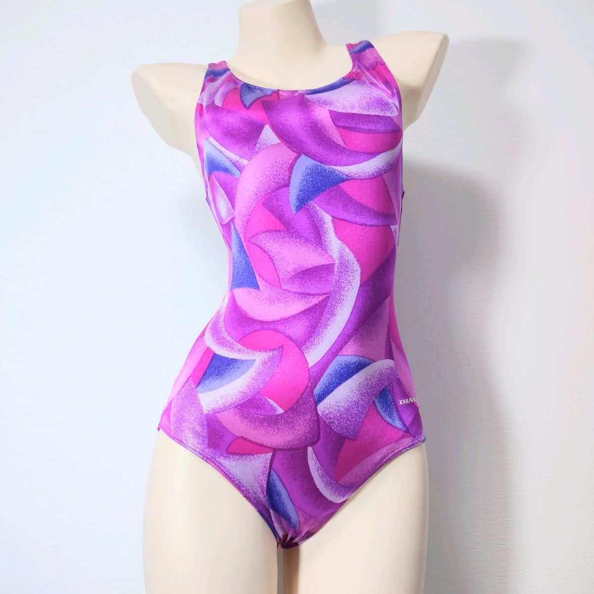 72*ASICSダイアナ女子競泳水着(LL)★光沢パープル紫ブルー青 幾何学模様★伸縮性あり大きいサイズ男性も