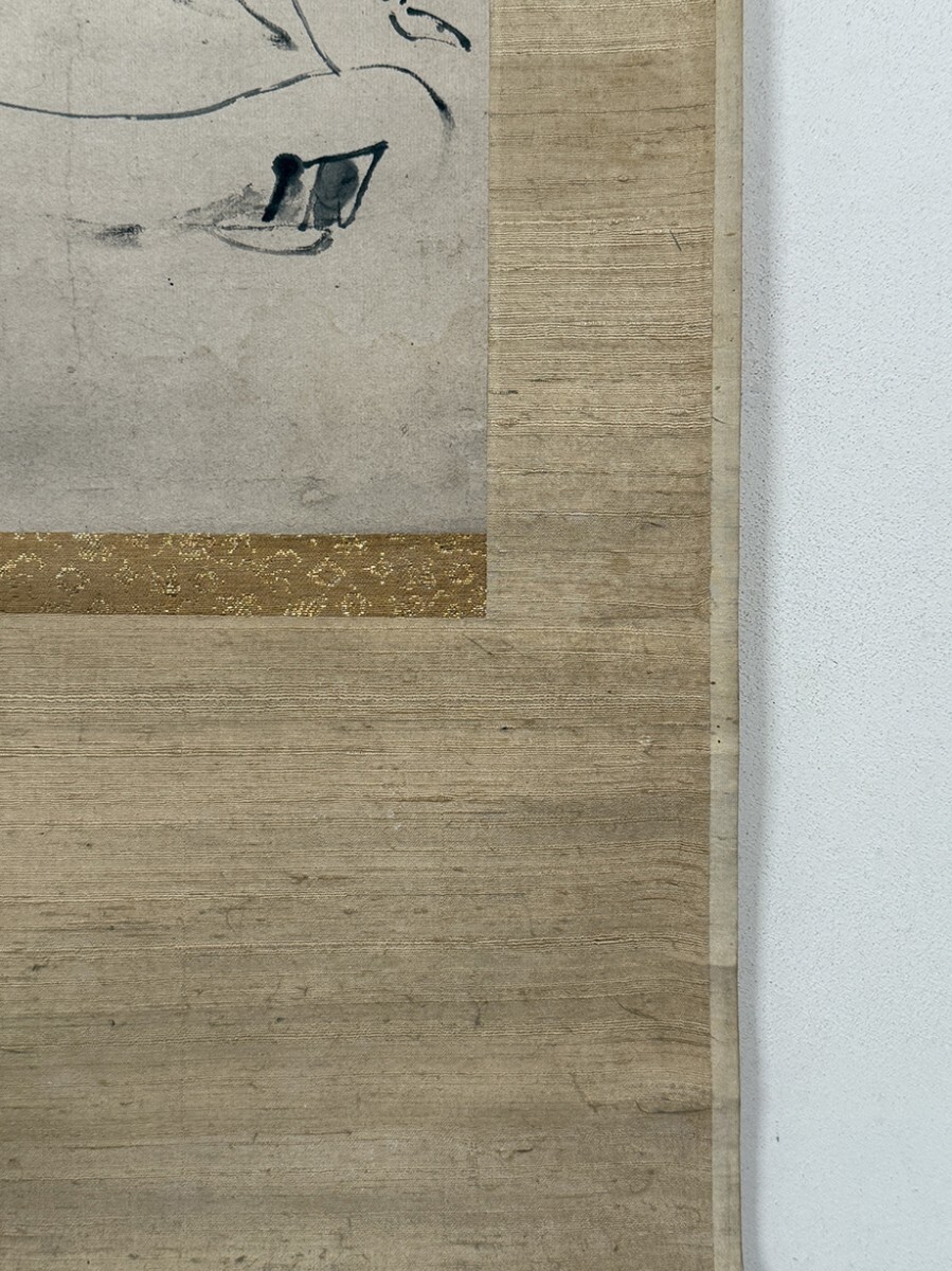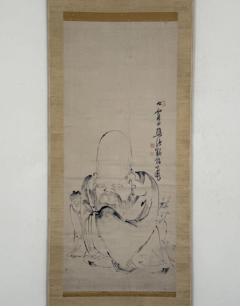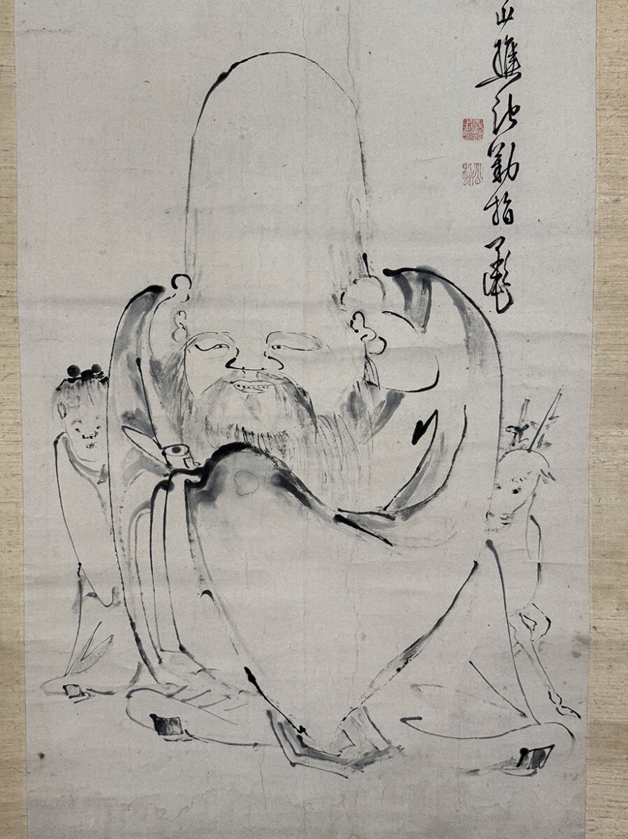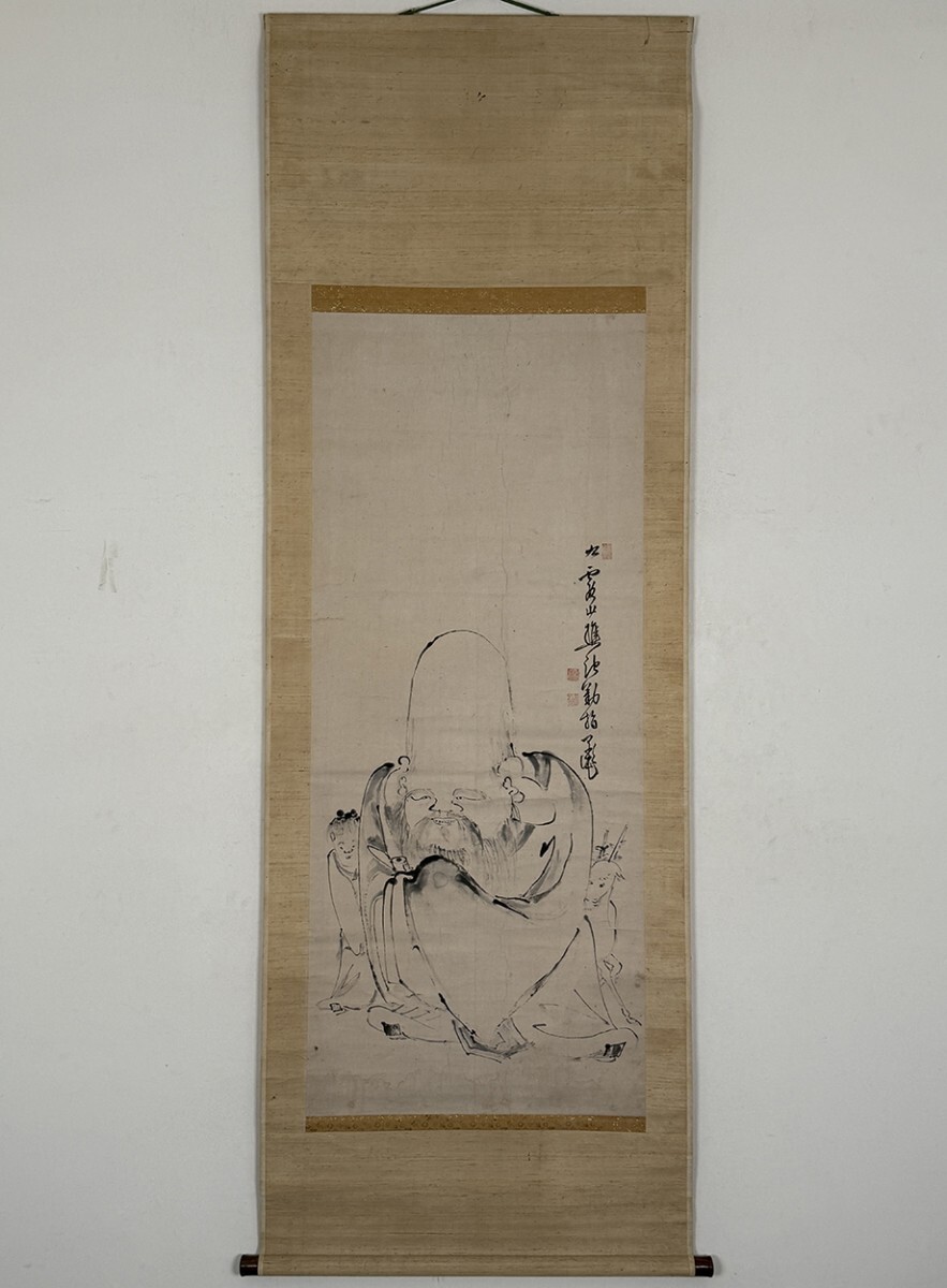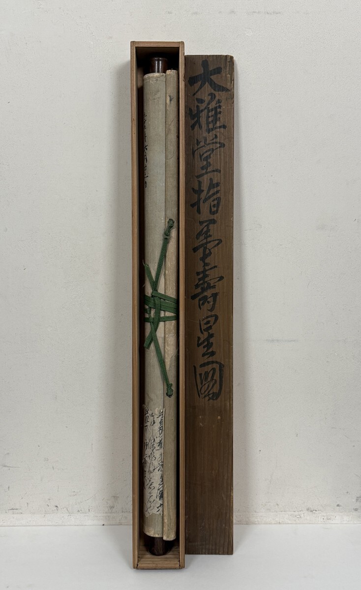 総丈サイズ…横 63 × 縦 184 cm 紙本水墨・箱入 状態…微少傷ミ 表具微少虫穴 本紙微少シミ・修復痕 箱少傷ミ 【印刷ではありません】 【真作】 池大雅 江戸中期の文人画家。京都生。姓は池野、幼名を又次郎、通称は秋平、名を勤・無名、字は公敏・子職・貸成・載成。号は大雅、霞樵など多数。15歳で扇屋を構え、扇子に絵を描いて生計を立てた。柳沢淇園、祇園南海らから教えを受ける一方で、舶載の木版画譜類を通して中国南宗画を独学。日本画の伝統と西洋絵画の表現法をとり入れて独特の画風を確立し、与謝蕪村とともに日本南画の大成者といわれている。安永5年(1776)歿、54歳。妻の玉瀾も画家として知られる。 |
