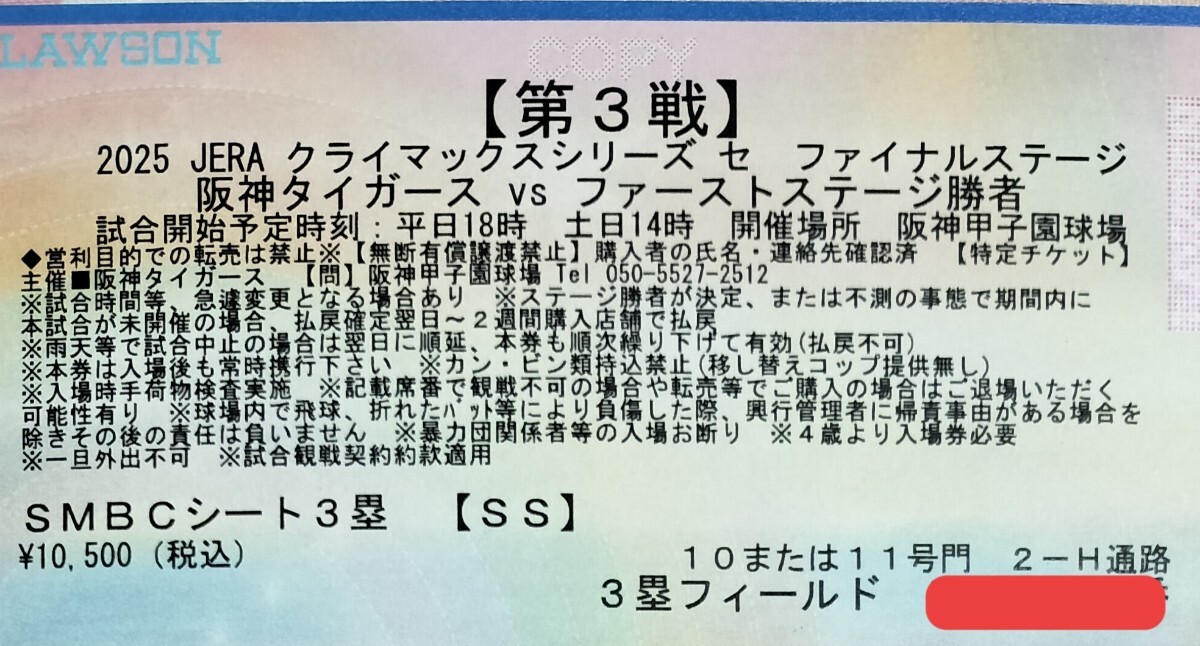 クライマックスシリーズ ファイナルステージ第3戦 阪神タイガース対1stステージ勝者のチケット1枚となります。