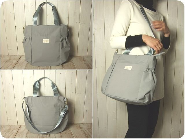 ・軽くてサラッとした触り心地の洗えるナイロン素材を使用した、レガートラルゴ【Legato Largo】の2WAYトートバッグです。メインポケットはシングルファスナータイプ、前面にオープンポケットが1つ、両サイドにゴムの入ったギャザーポケットがあり、内側にもオープンポケットが2つ付いています。持ち手は長さ46センチで、スナップでまとめることができます。付属のショルダーストラップは幅3.2センチで長さは65~120センチの間で調節可能で斜め掛けもできます。