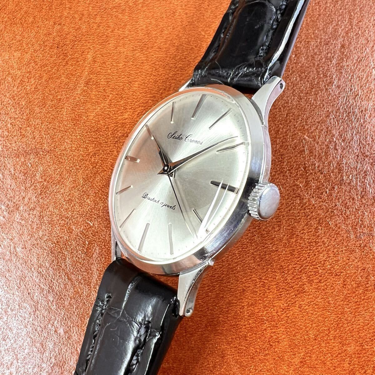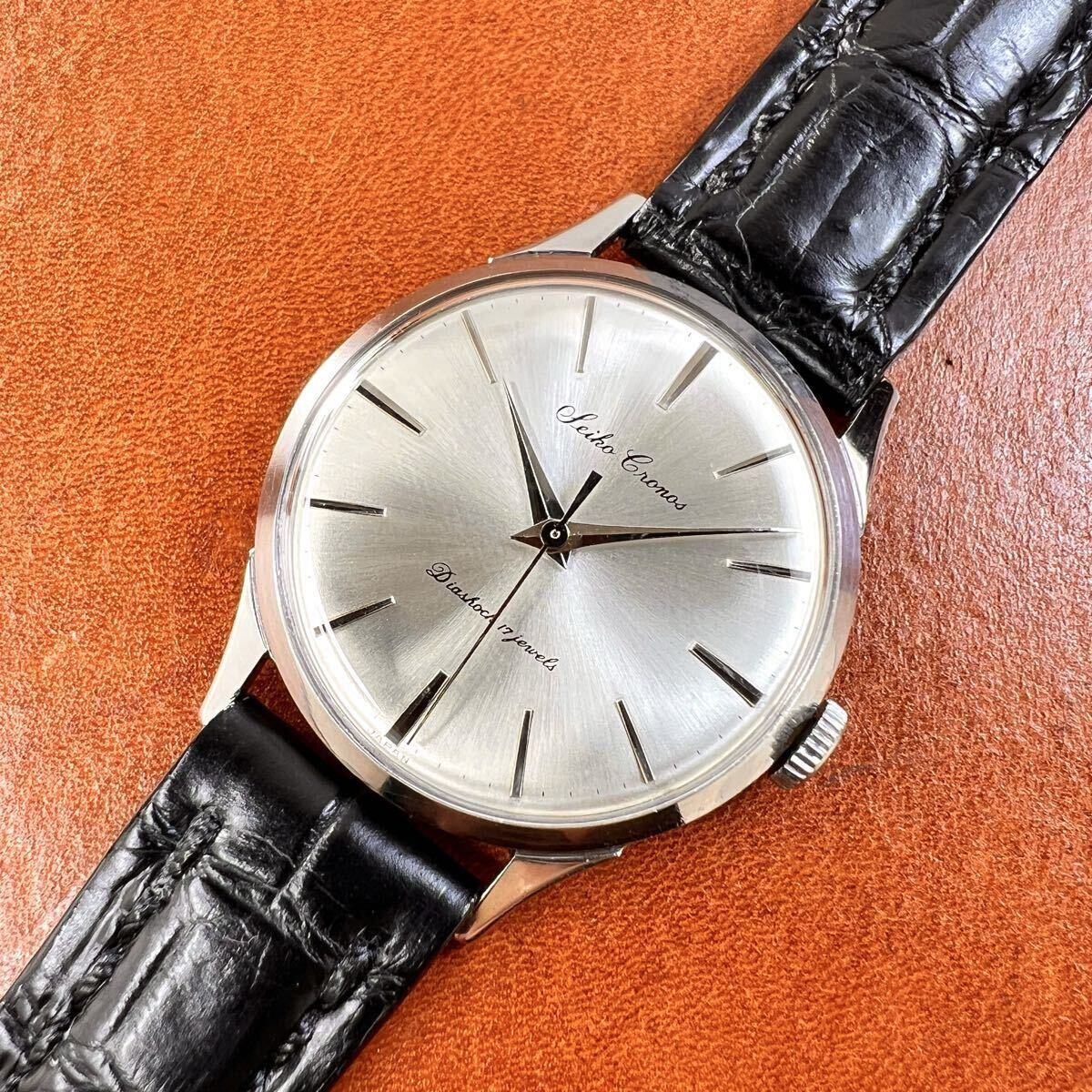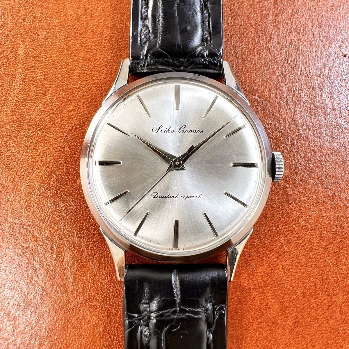 OH済! 極上美品! SEIKO Cronos 17石 クロコダイル本革手縫いベルト Dバックル付 セイコー クロノス 14035 SS 手巻 国産 ビンテージ 腕時計