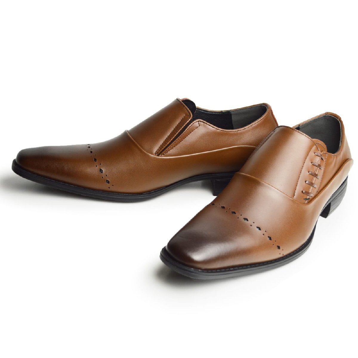 新品■26.5cm ビジネスシューズ 革靴 サイドゴア スリッポン 飾り紐 脚長 スクエアトゥ ロングノーズ 2E 日本製 フォーマル 紳士靴