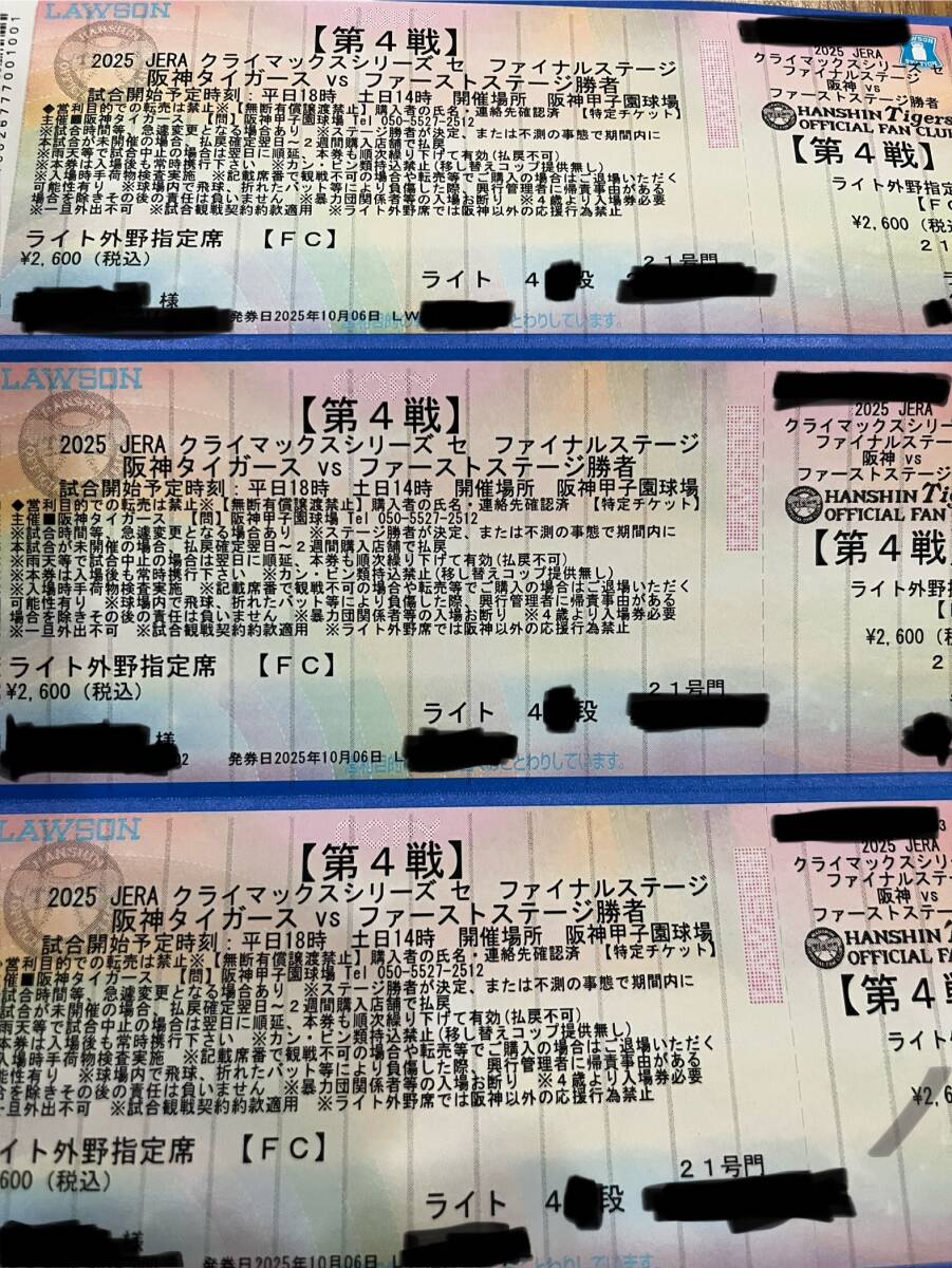 クライマックスシリーズファイナルの第4戦 阪神甲子園球場ライトスタンド40~50段 200~220番内の3連番になります。