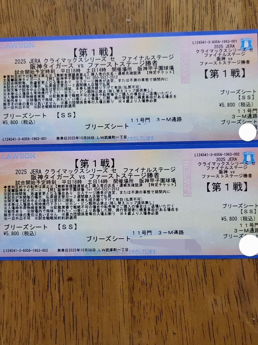 クライマックスシリーズ セ、ファイナルステージ 第1戦 ブリーズシートペアーチケット