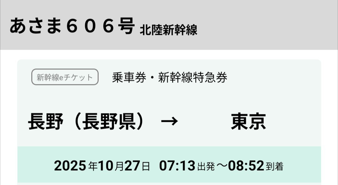 10月27日 長野駅7:13発→東京駅8:52着のあさま606号の新幹線切符2枚です。A,B席です。