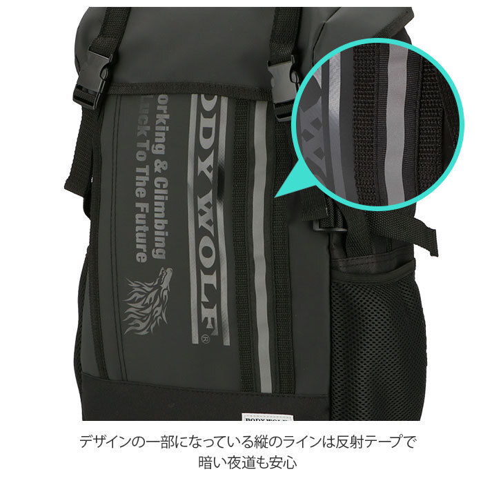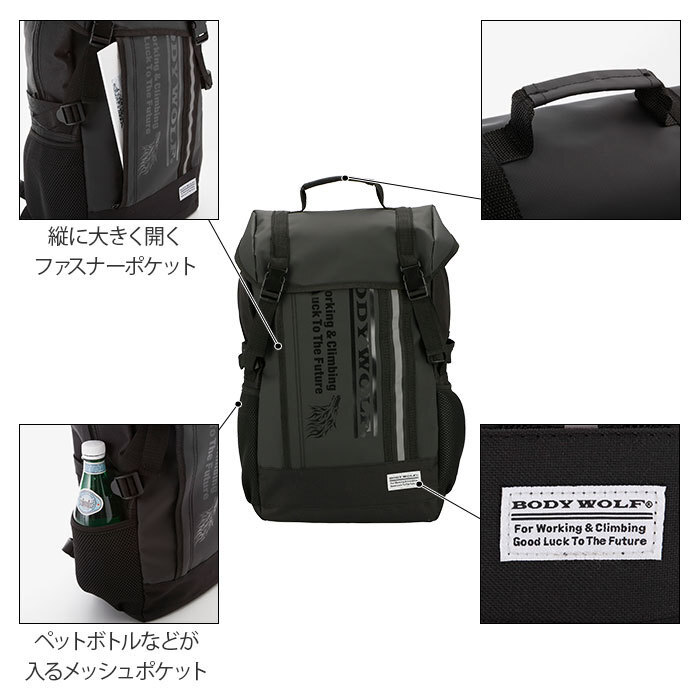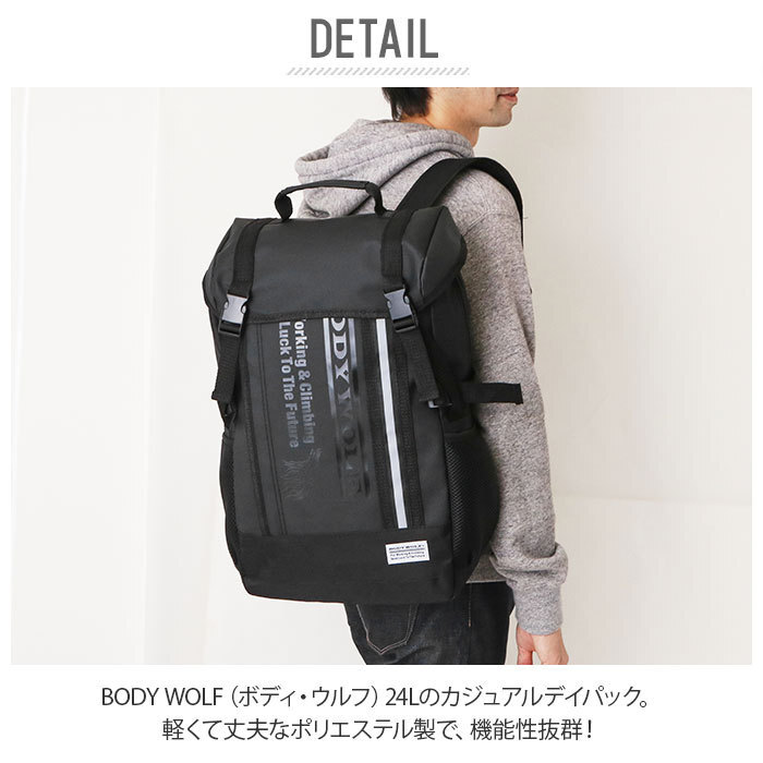| 商品説明 | ・軽くて丈夫なポリエステル製で、機能性抜群!BODY WOLF(ボディ・ウルフ)24Lのカジュアルデイパック。 ・上部のフラップやフロントの表面には、水に強いコーティング加工。 ・上部のフラップはバックルでしっかり固定。 ・フラップを開けるとメイン収納があり、開口部はダブルファスナー。大きく開いて、中が見やすく物の出し入れがしやすい。 ・メイン収納内側には、フロント側に大きめのオープンポケット×1、背面側には、小さめのファスナーポケット×1と、その裏にマジックテープで開閉できるポケット×1。クッション性のあるポケットなので、ノートPCなどの収納も可能。 ・フロントには、縦に大きく開くファスナーポケット付き。 ・デザインの一部になっている縦のラインは、反射テープ。 ・両サイドには、ペットボトルや折りたたみ傘などが入るメッシュポケット付き。 ・背面には、メイン収納に直結したファスナー付きで使いやすい。 ・背面やショルダーの裏はメッシュ素材なので、蒸れにくく、長時間の使用も快適。 ・ショルダーは調節可能で、チェストベルト付き。 ・持ち手が2か所あって、使いやすい。 |