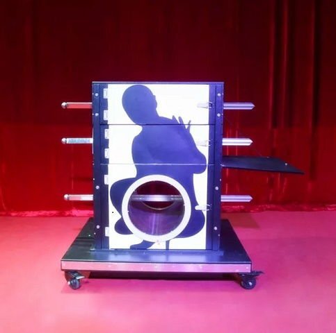 イリュージョンが完了すると、アシスタントの中央部分が元の位置にスライドして戻され、剣とチューブが取り外され、彼女は無傷でキャビネットから出ます。