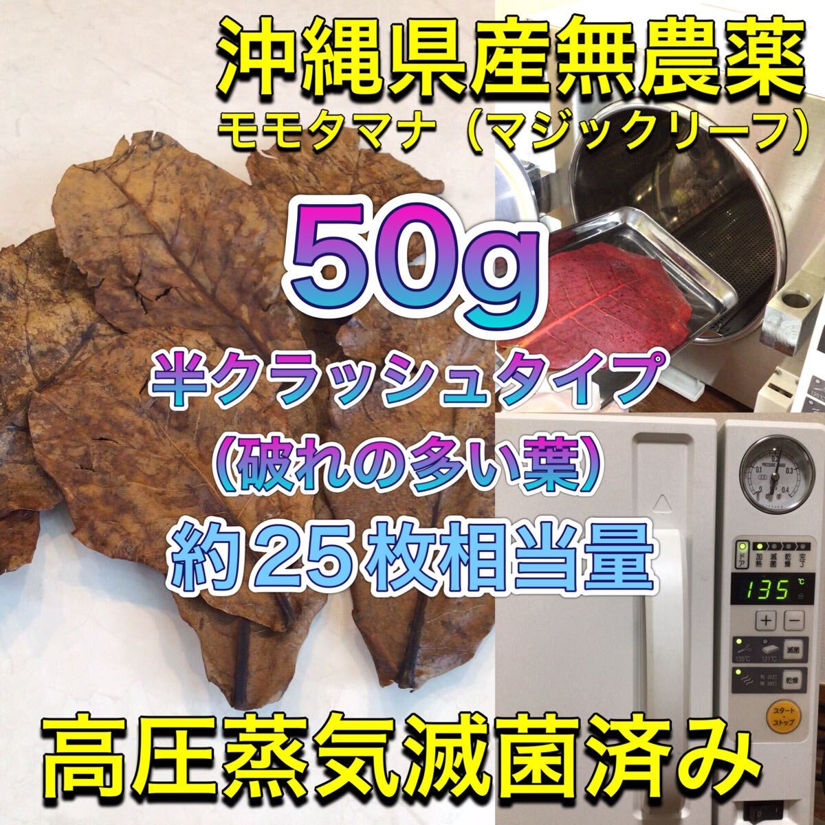 ▼商品 : 高圧蒸気滅菌済み沖縄県産無農薬モモタマナ (マジックリーフ)半クラッシュタイプ(破れの多い葉)