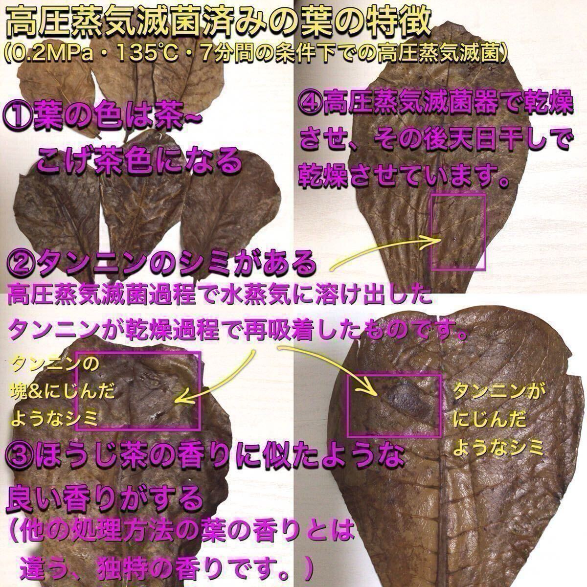 ・高圧下において蒸気で滅菌するため、熱湯煮沸と違いお湯の中には入れないのでタンニン等の有効成分が滅菌過程で失われにくいです。(そのため葉に所々茶色のシミがありますが、これは滅菌過程で葉についた蒸気に溶け出したタンニンが乾燥過程で再吸着したものです。)