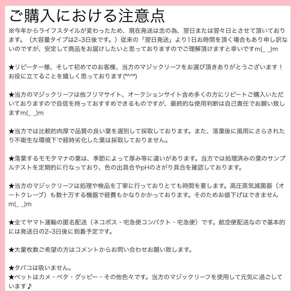 ・一般的にマジックリーフは水20リットルに20cm程の葉を1枚(約2.0g)が一般的な使用量です。これをもとに、按分計算で使用量を求めて下さい。以下、葉のサイズ別のおすすめ使用量です。