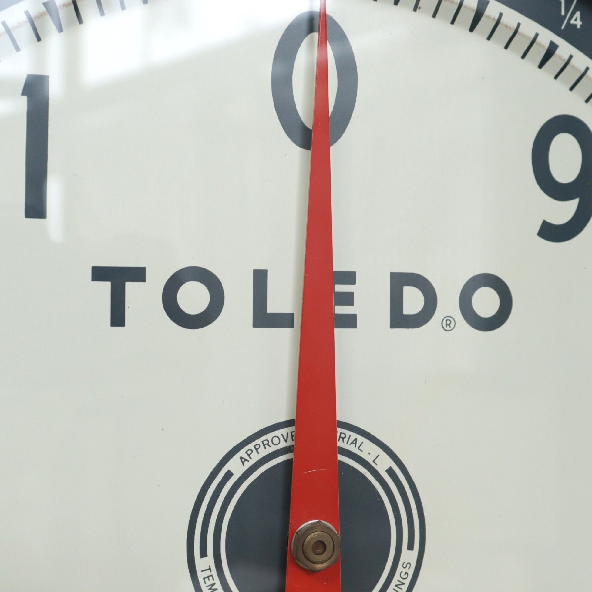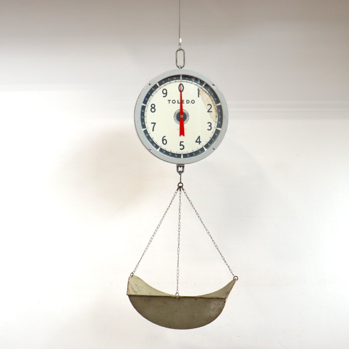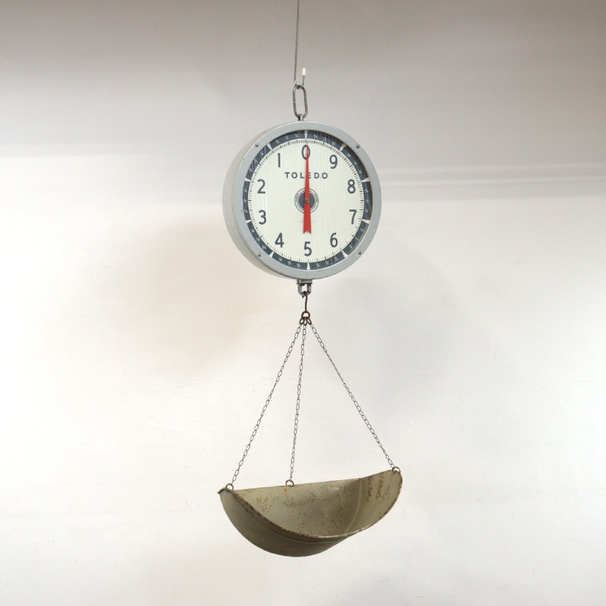 商品説明 explanation | 1952年代の「TOLEDO」社のハンギングスケールです。(MODEL 2110) バスケット付きで30ポンド(約13.61Kg)まではかることができます。 重厚な作りになっていて、両面に金属製の文字盤がついています。 店舗などのディスプレイにいかがでしょうか。 |