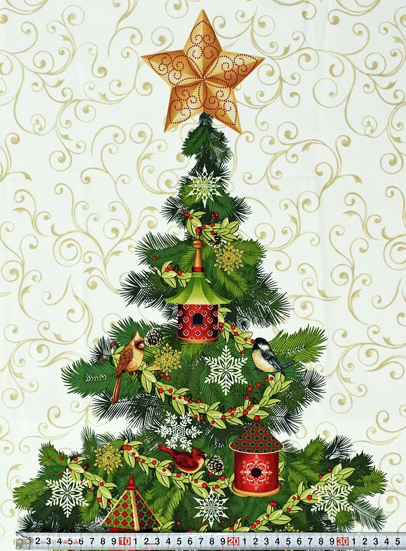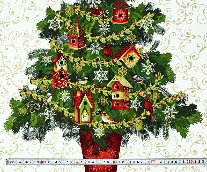 頂上には星、巣箱とヤドリギのモール、雪の結晶、松ぼっくりなどを飾ったクリスマス・ツリー。