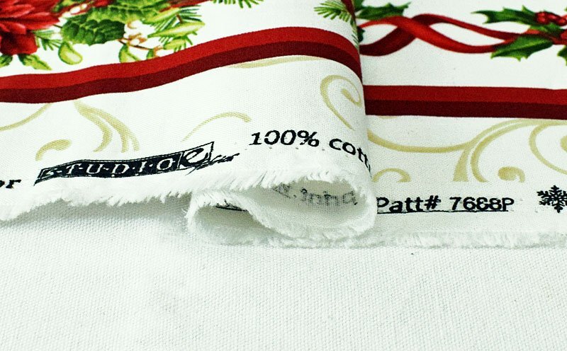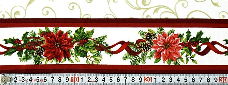 ポインセチアのクリスマス・アレンジメントのボーダーが生地の上下のミミに沿っています。