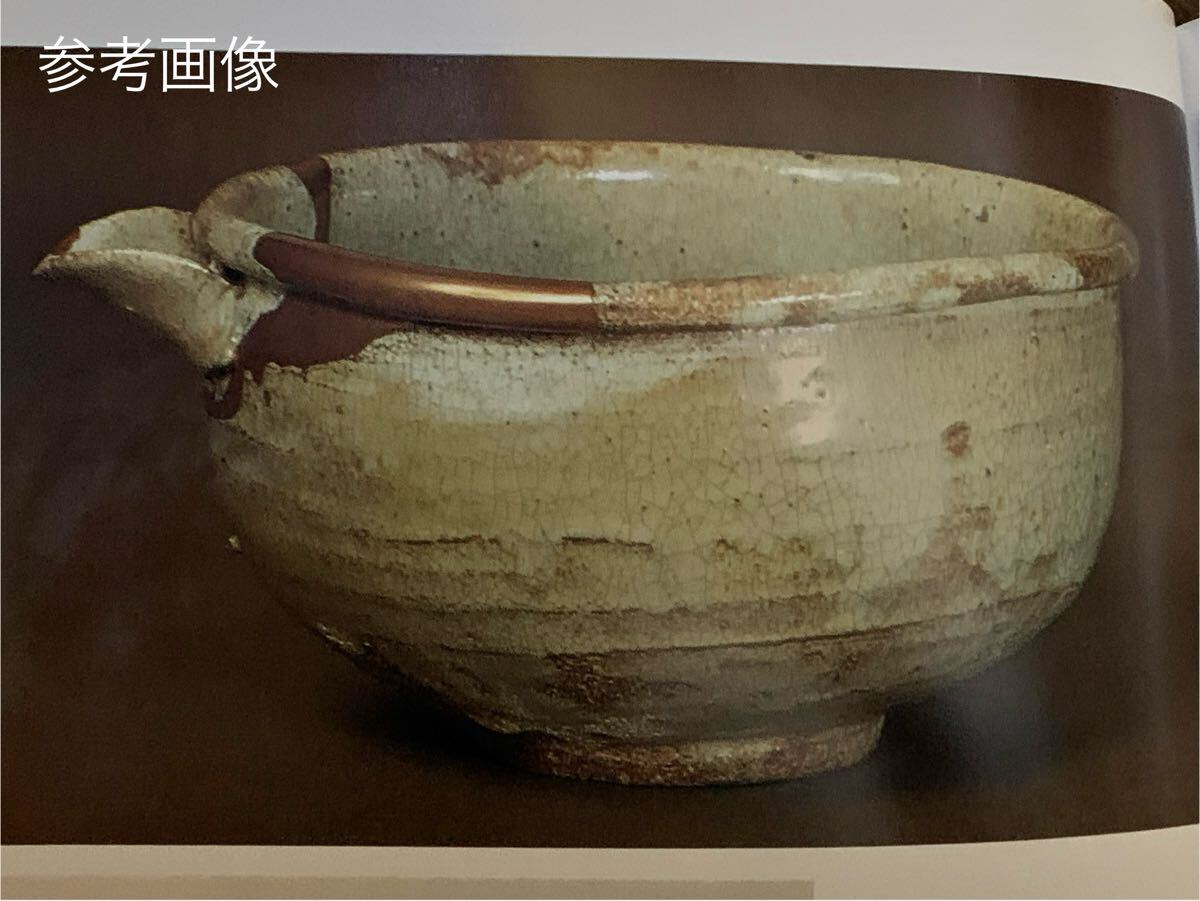 画像にある参考資料とは口の形が異なりますが、本品は発掘時に欠損したものを前所有者がラフに直したものでございます。思いの外綺麗に酒が注げますのでそのままにしておりました。得意な方は一度外されて、あらためてきれいに直されるのもよろしいかと思います。