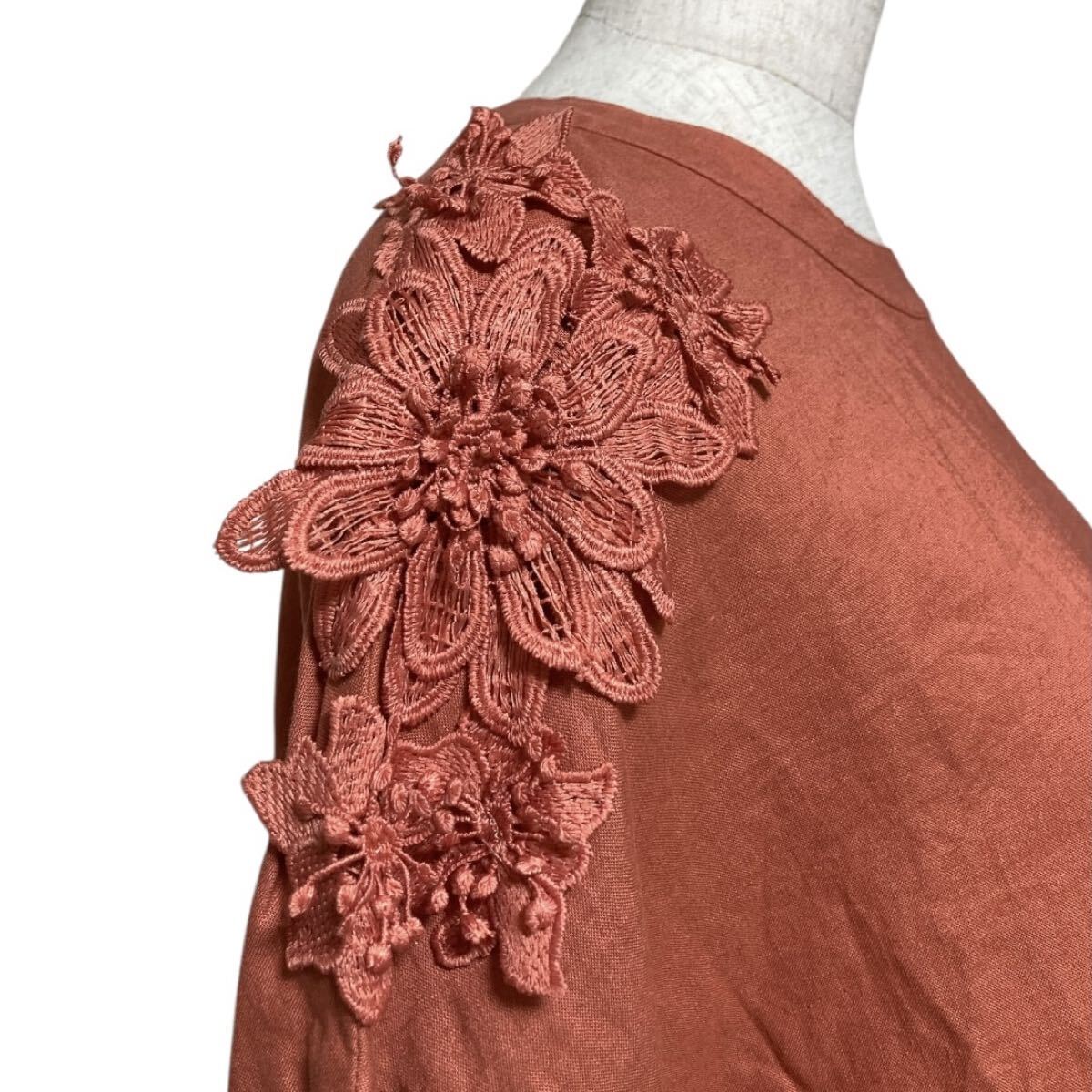 肩の立体的な花柄レース刺繍が華やかで、上品なデザイン。