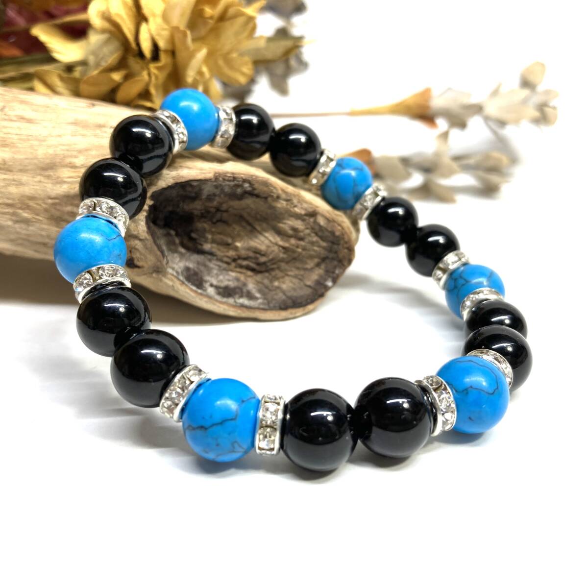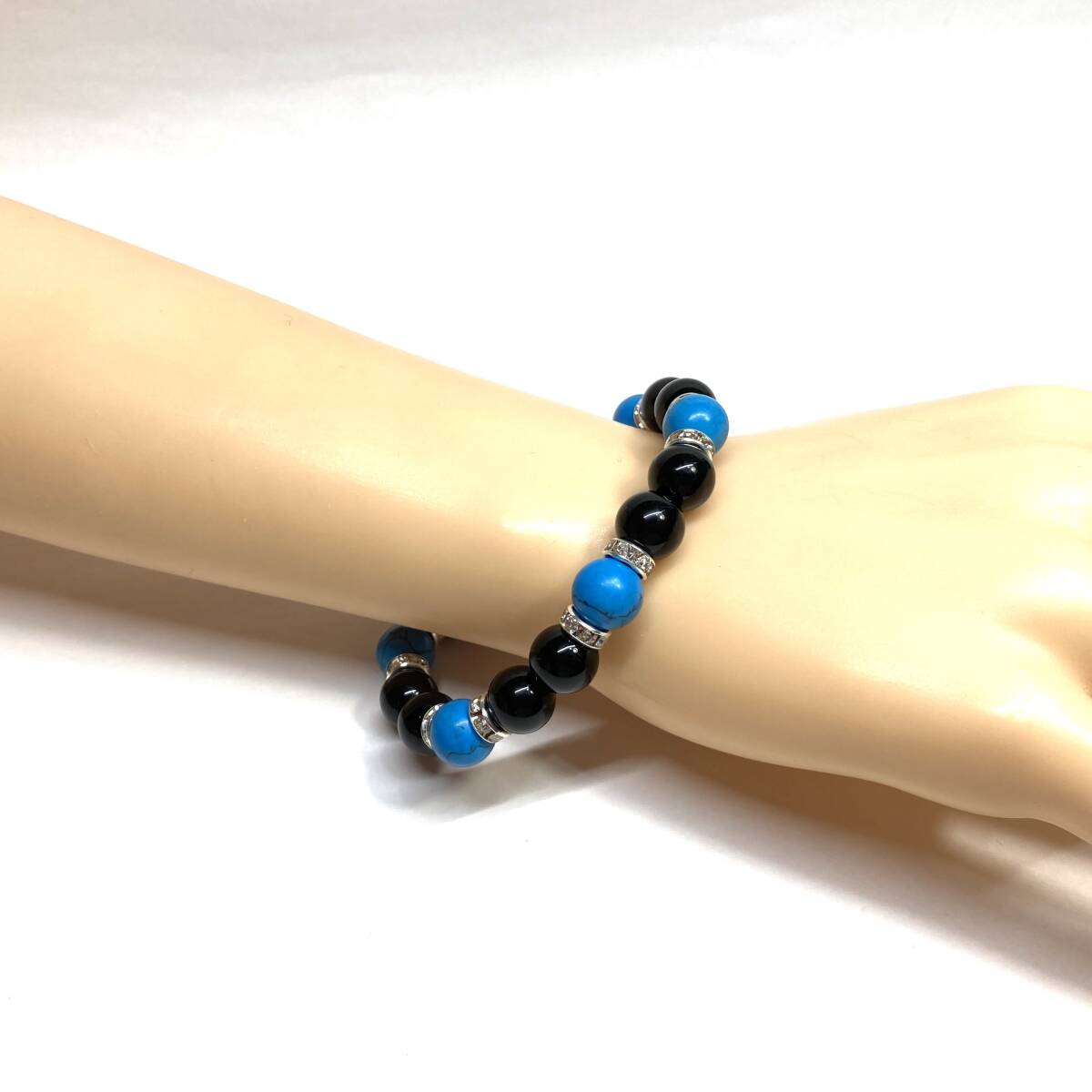 こちらは、モリオンとターコイズを組み合わせたパワーストーンブレスレットです。間にはロンデルを挟み高級感あるデザインに仕上げております。石大きさは腕にも馴染みやすいように10mm玉で内径約18cm(伸可能)です。(サイズ変更の場合は取引ナビにてご連絡をお願いします。) 数に限りがございますので気になる方はお早めにどうぞ。