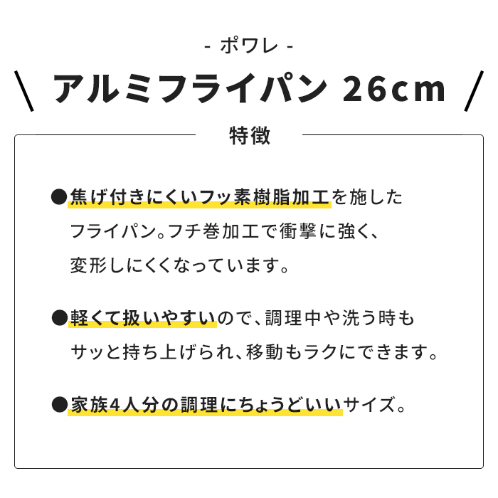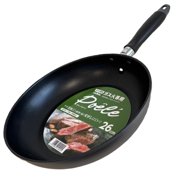 | 焦げ付きにくいフッ素樹脂加工を施したフライパン26cm。 軽い扱いやすいので、調理中や洗う時もサッと持ち上げられ、移動もラクにできます。 フチ巻加工で衝撃に強く、変形しにくくなっています。 家族4人分の調理にちょうどいい26cmサイズ。 ガス火専用。 |