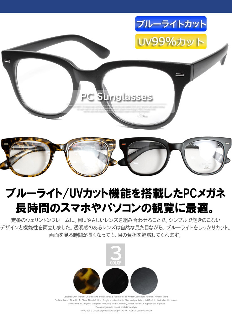 商品説明 | スマホやパソコンを見る時間が長くなる今、目の疲れを感じる方も多いと思います。そんな日常に取り入れたいのが、ブルーライトカット機能を搭載したウェリントン型のPCメガネです。 |
