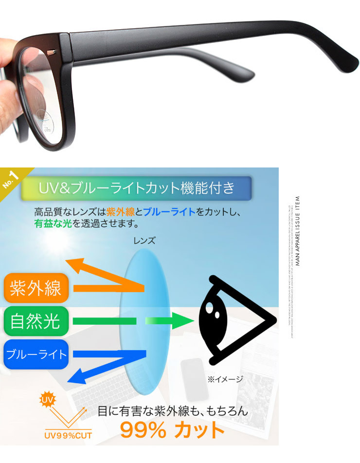 商品名 | 【新品】 F マットブラック×クリア ブルーライトカットメガネ ウェリントン パソコン スマホ PC眼鏡 度なし UVカット メンズ レディース |