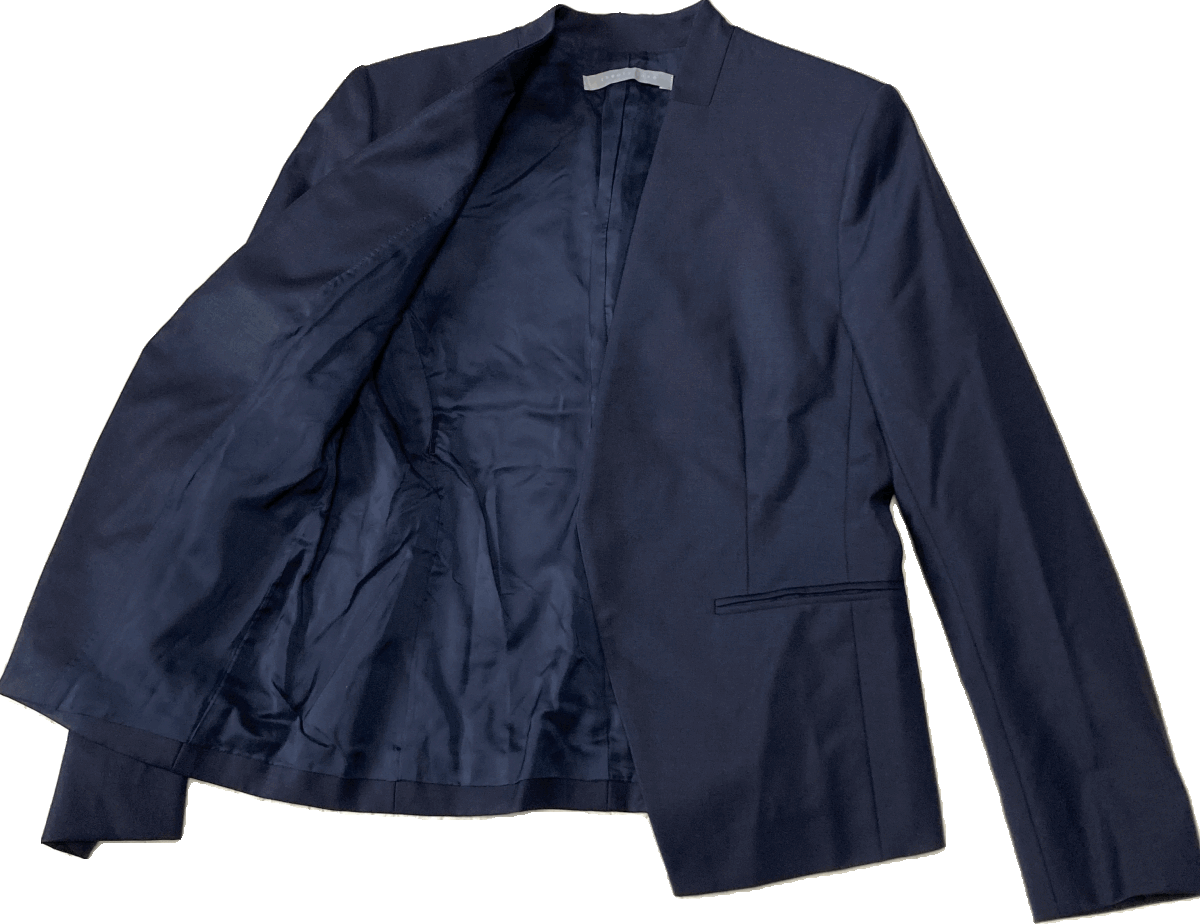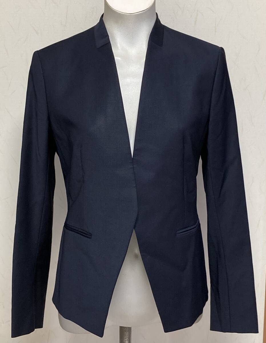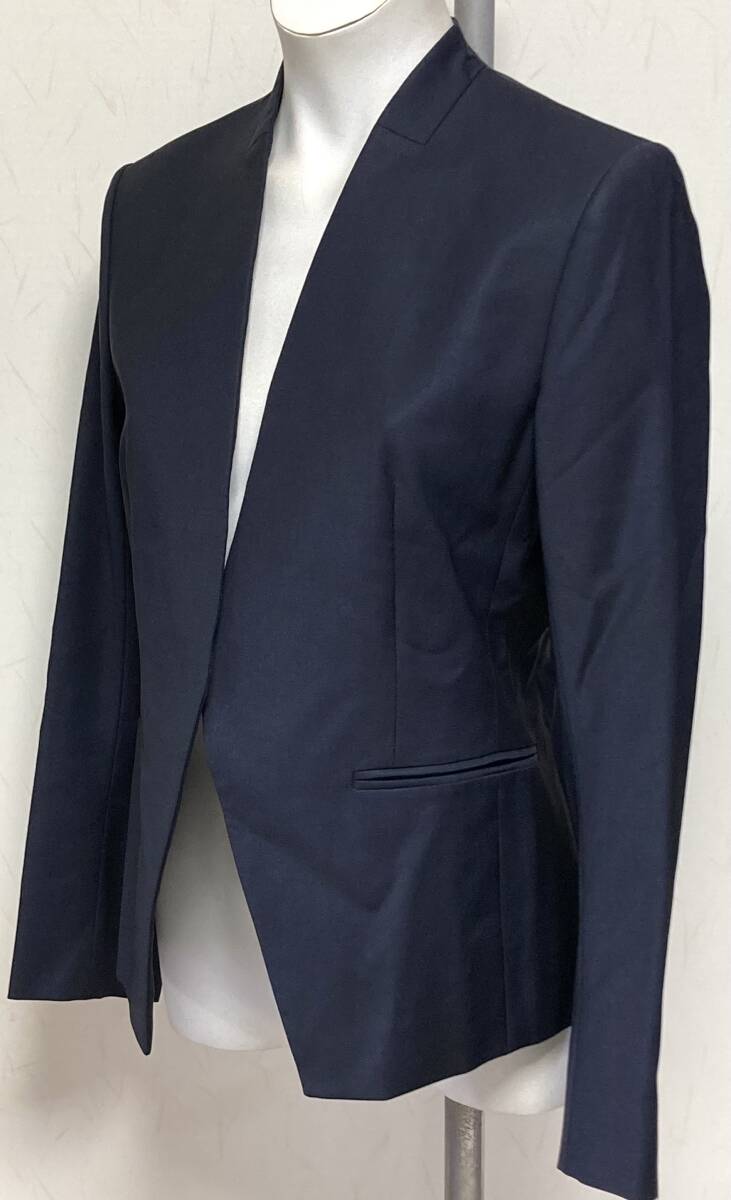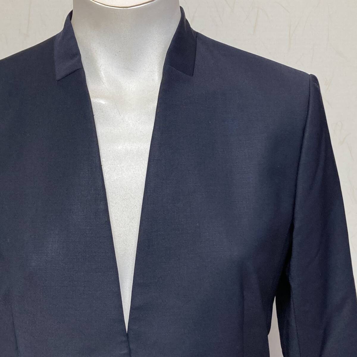 ■V開き、前留め無し、切りポケット付き、極薄い肩パッド付き、上質ストレッチウールのノーカラージャケットです。