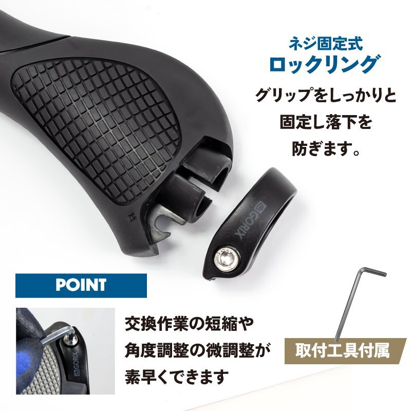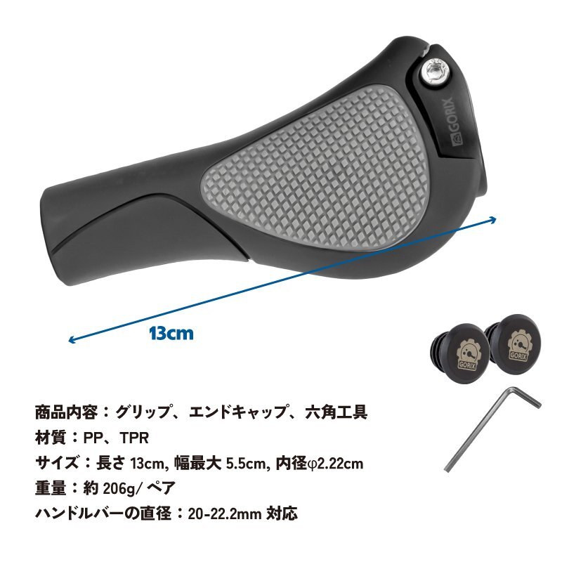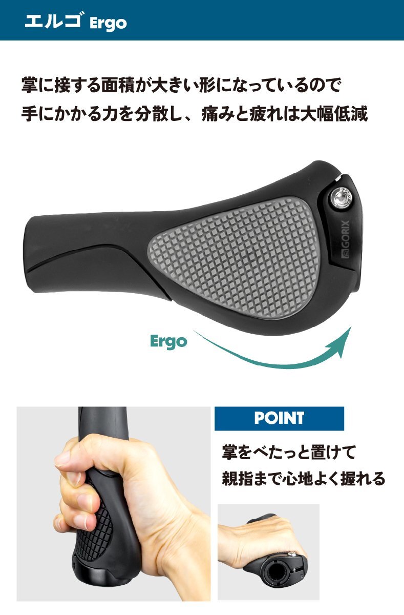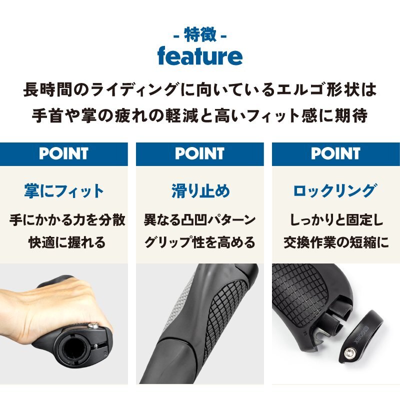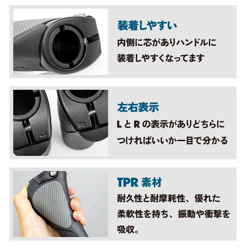 人間工学に基づいた設計により、握りやすく疲れにくいデザインのエルゴグリップ。 手の平にしっかりとフィットしてしっくりくる握り心地。 グリップ表面の凸凹が滑り止めになり汗や雨に濡れてもグリップ力を向上させます。 手首の疲れや、腱鞘炎で悩んでいる方におすすめです。 掌の広さから親指まで心地よく握られ、体の重みが手の平にうまく分散し、痛みと疲れを大幅低減。 クロスバイクやマウンテンバイク・ミニベロなどフラットハンドルの自転車に最適。 [エルゴデザイン] 長時間のライディングに向いているエルゴ形状は、手首や掌の疲れの軽減と高いフィット感が期待できます。 手の平に接する面積が大きい形になっているので手にかかる力を分散し、痛みと疲れは大幅低減。 人間工学(エルゴノミクス)に基づいたデザイン。 [ロックオンタイプ] ロックオンタイプ(ネジ固定)で交換作業の短縮や角度調整の微調整が素早くできます。 [滑り止め] グリップ表面には異なる凸凹パターンを施しグリップ力を向上。 汗や雨で濡れても滑りにくく手に吸い付くようなグリップ力を発揮。 [様々な自転車に対応] ハンドルバーの直径:22.2mm。ほとんどのタイプの自転車に適しています。 ※一部、特殊なハンドル径のハンドルでは使用できませんので、ご注意下さい。 [TPR素材] 耐久性と耐摩耗性、耐滑り性、耐衝撃性に優れています。 手に吸い付くようなグリップ感。 商品内容グリップ、エンドキャップ、六角工具 サイズ長さ13cm, 幅最大5.5cm, 内径φ2.22cm 重量約206g/ペア 材質PP、TPR 対応フィットハンドルバーの直径20-22.2mm |