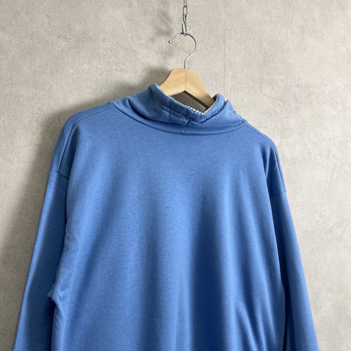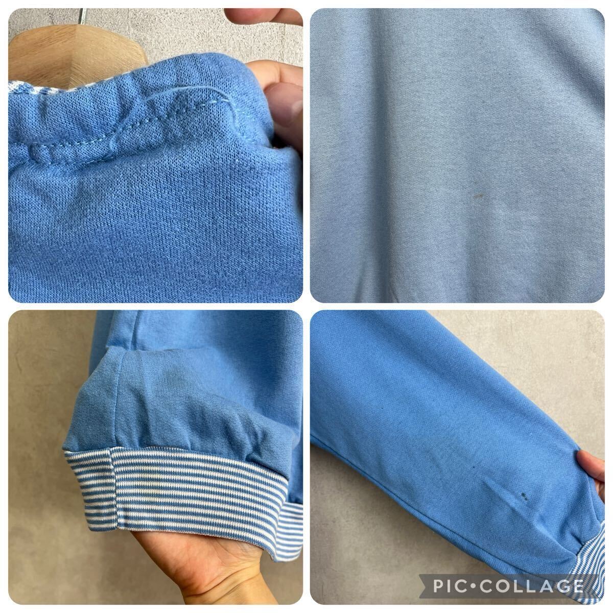 鮮やかなブルー系の色味にブランドロゴプリント。リブのボーダーがマリンテイストな一着。