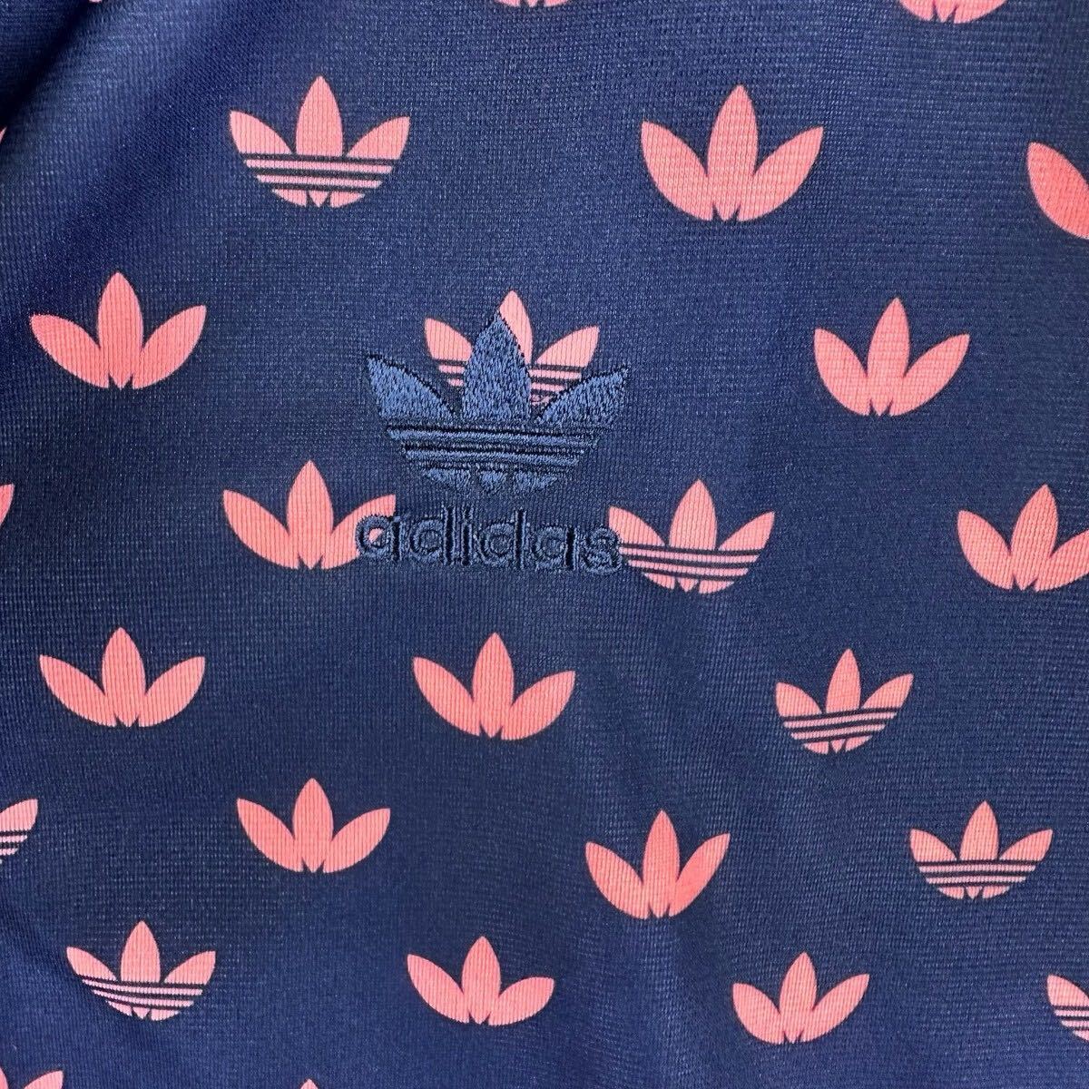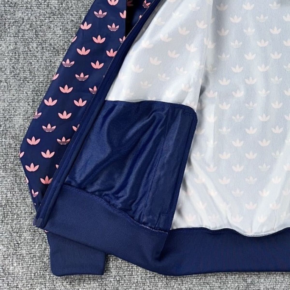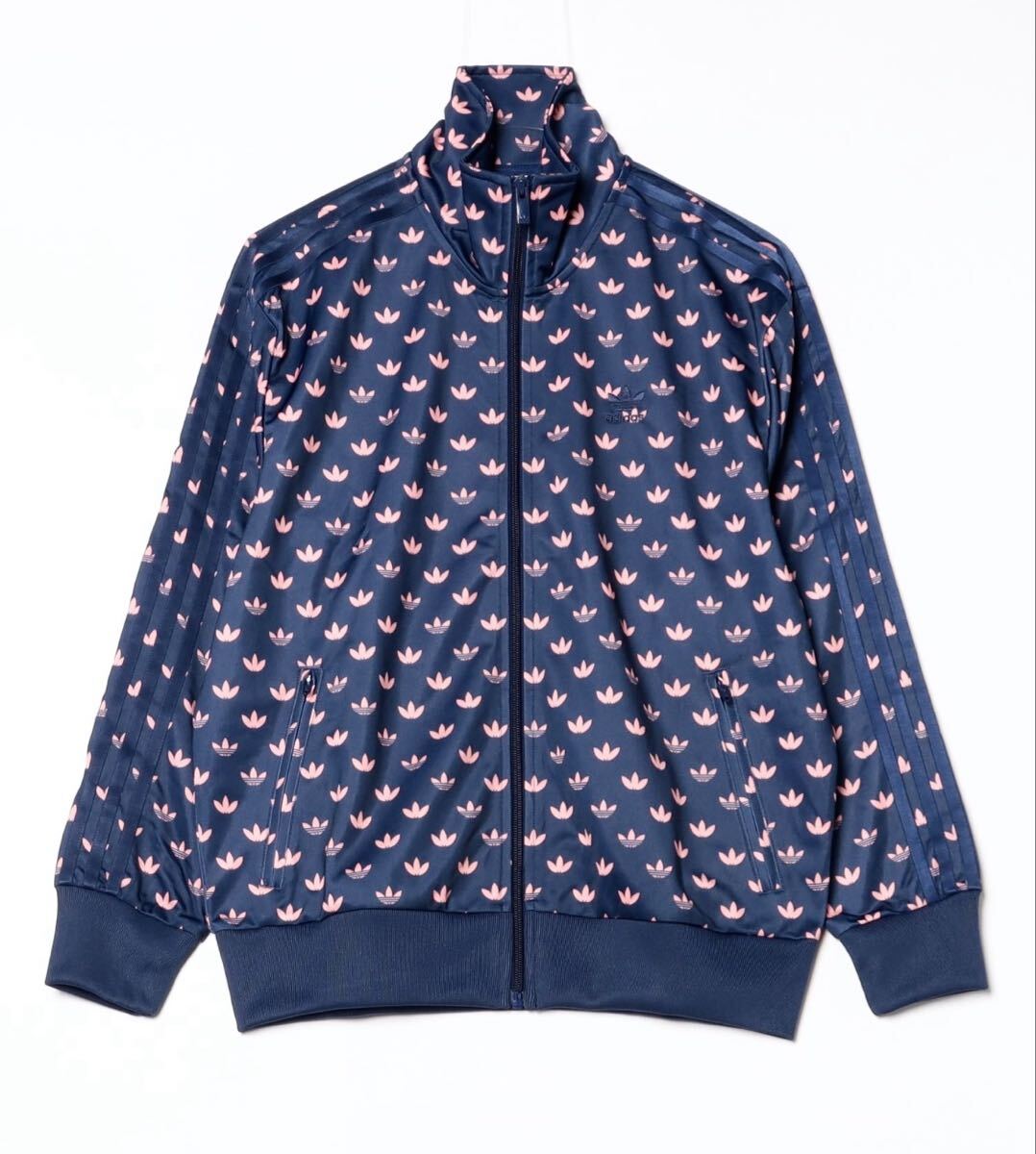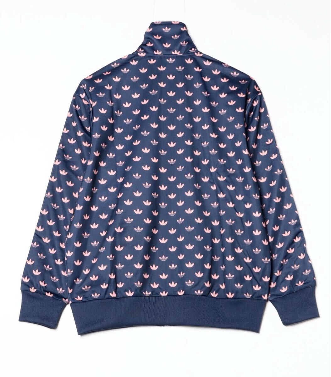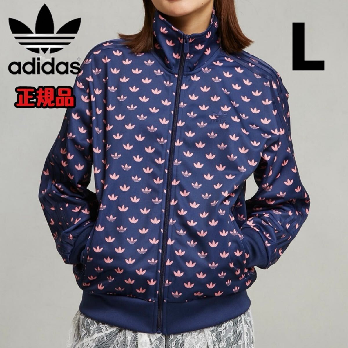 美品 adidas アディダス レディース トラックジャケットモノグラム ファイヤーバード トラックトップス ジャージ 総柄 ネイビー L レ43