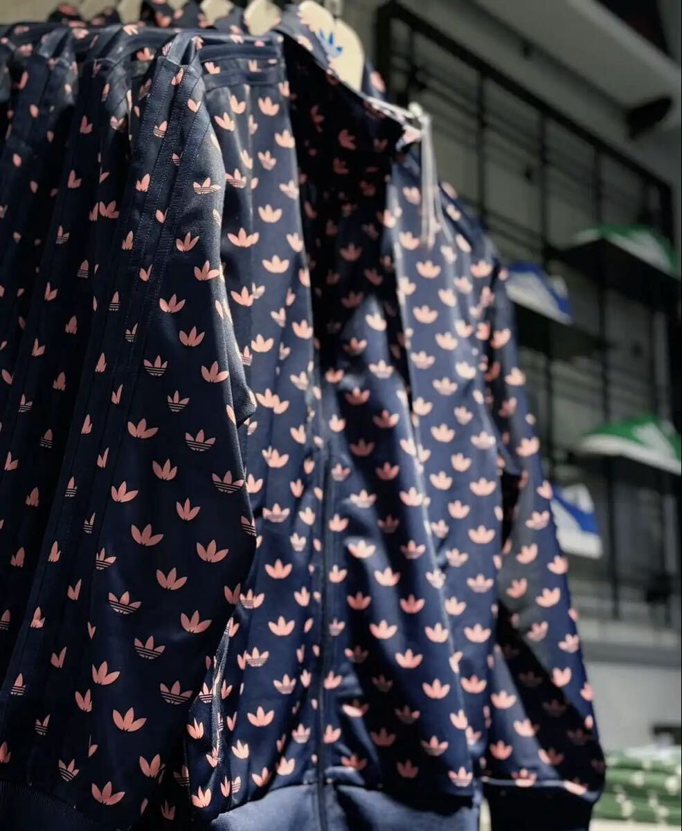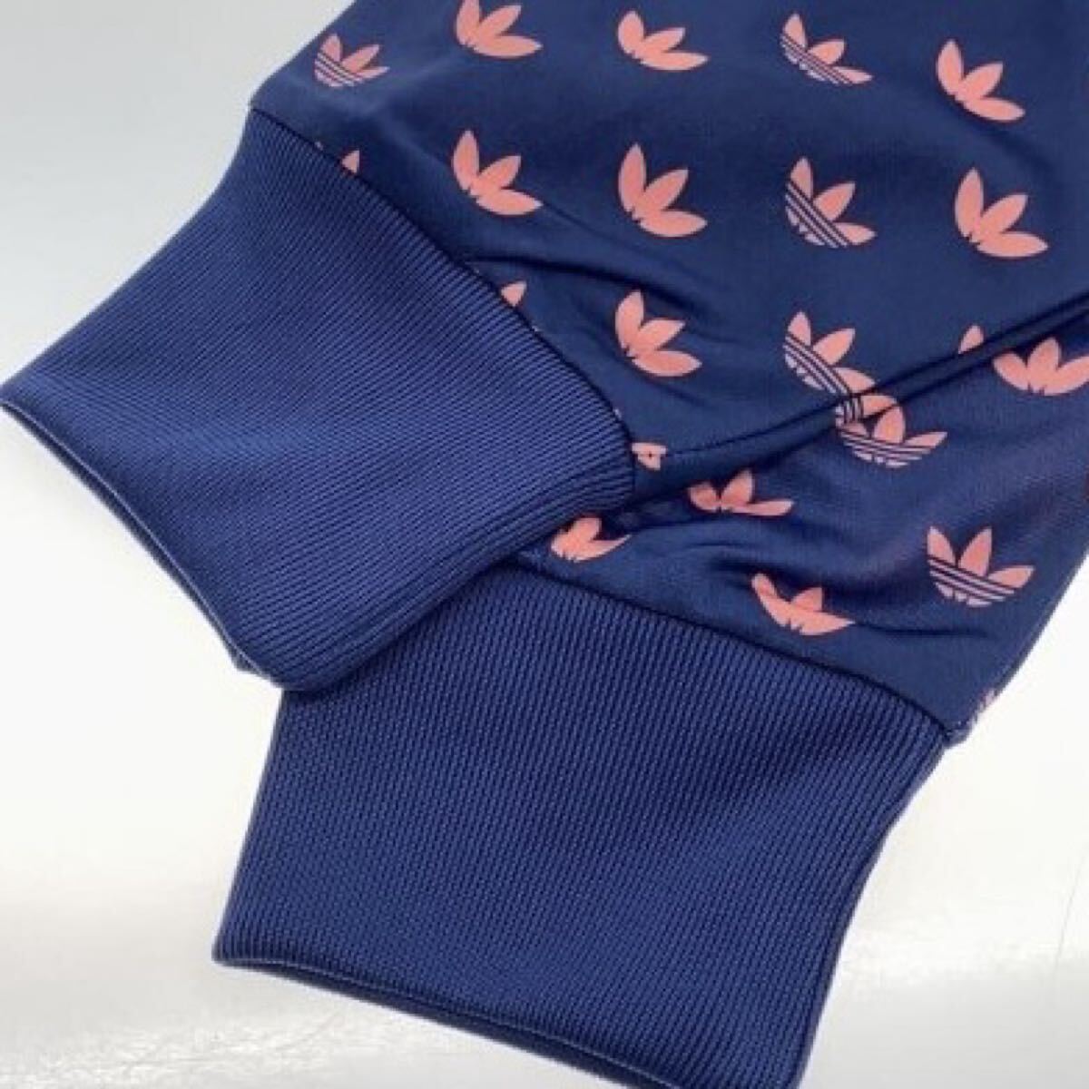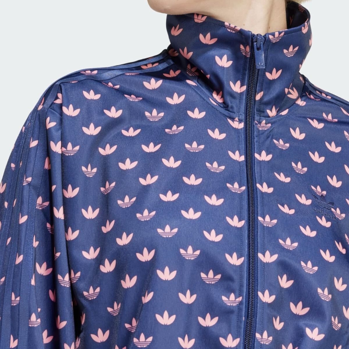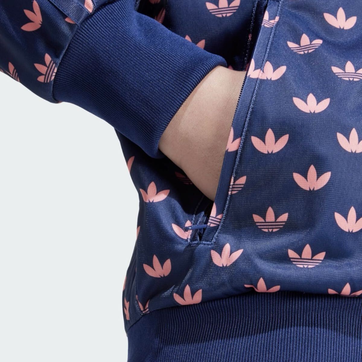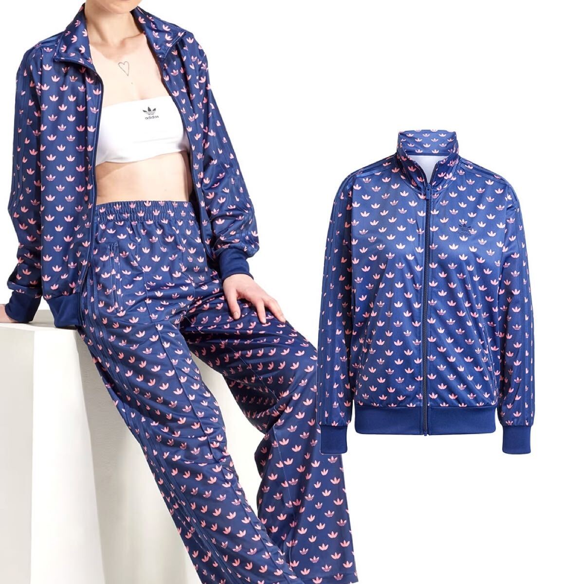 美品 adidas アディダス レディース トラックジャケットモノグラム ファイヤーバード トラックトップス ジャージ 総柄 ネイビー L レ43
