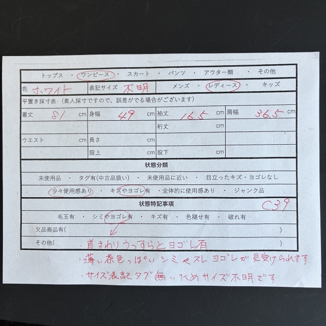 ・シミやヨゴレ有(首まわりうっすらとヨゴレ有)