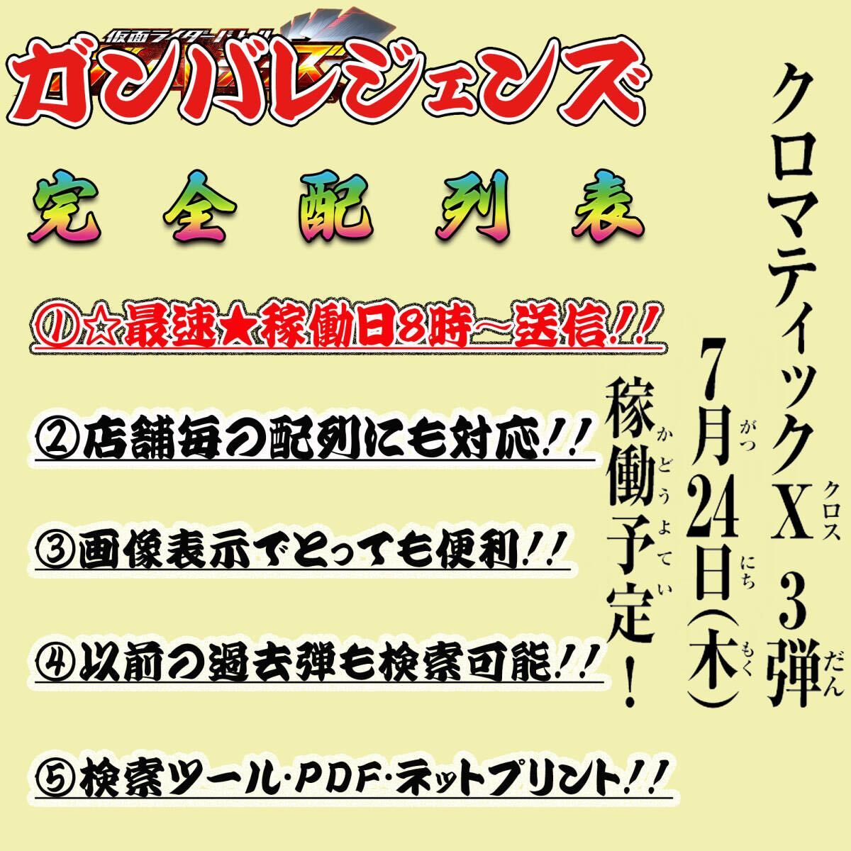 ◆ 商 品 説 明 ◆ | ※※※※※※※※※※※※※※※※※※※※※※※※ ★落札特典★ ①即決即送信!! ~入金の確認がとれ次第、全12パターンの配列を即送信~ ②検索ツールに新機能が続々搭載!! ~配列・画像同時表示などの新機能が搭載~ ③過去弾も同時に検索可能!! 【※クロマティックX1弾~3弾・シンクロ神話1章~6章、旧1弾~5弾の過去弾もツールで検索可能!!】 ④稼働後もしっかりサポート!! ~前弾同様パターン追加次第、逐一改訂版・データ更新の配列を提供させていただく予定です~ ⑤Netprint・PDF送信!! ~ツールと一緒にNetprint/PDFで送信いたします~ ※※※※※※※※※※※※※※※※※※※※※※※※ | |