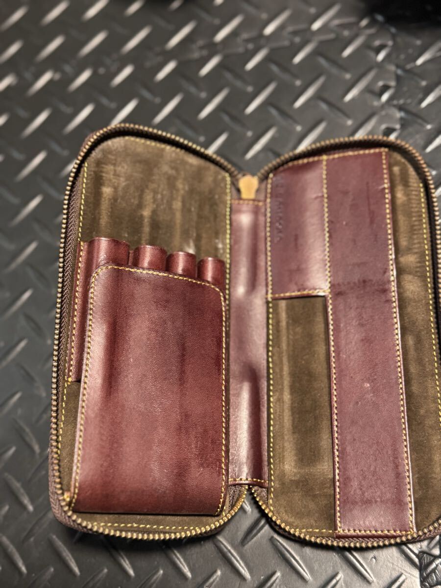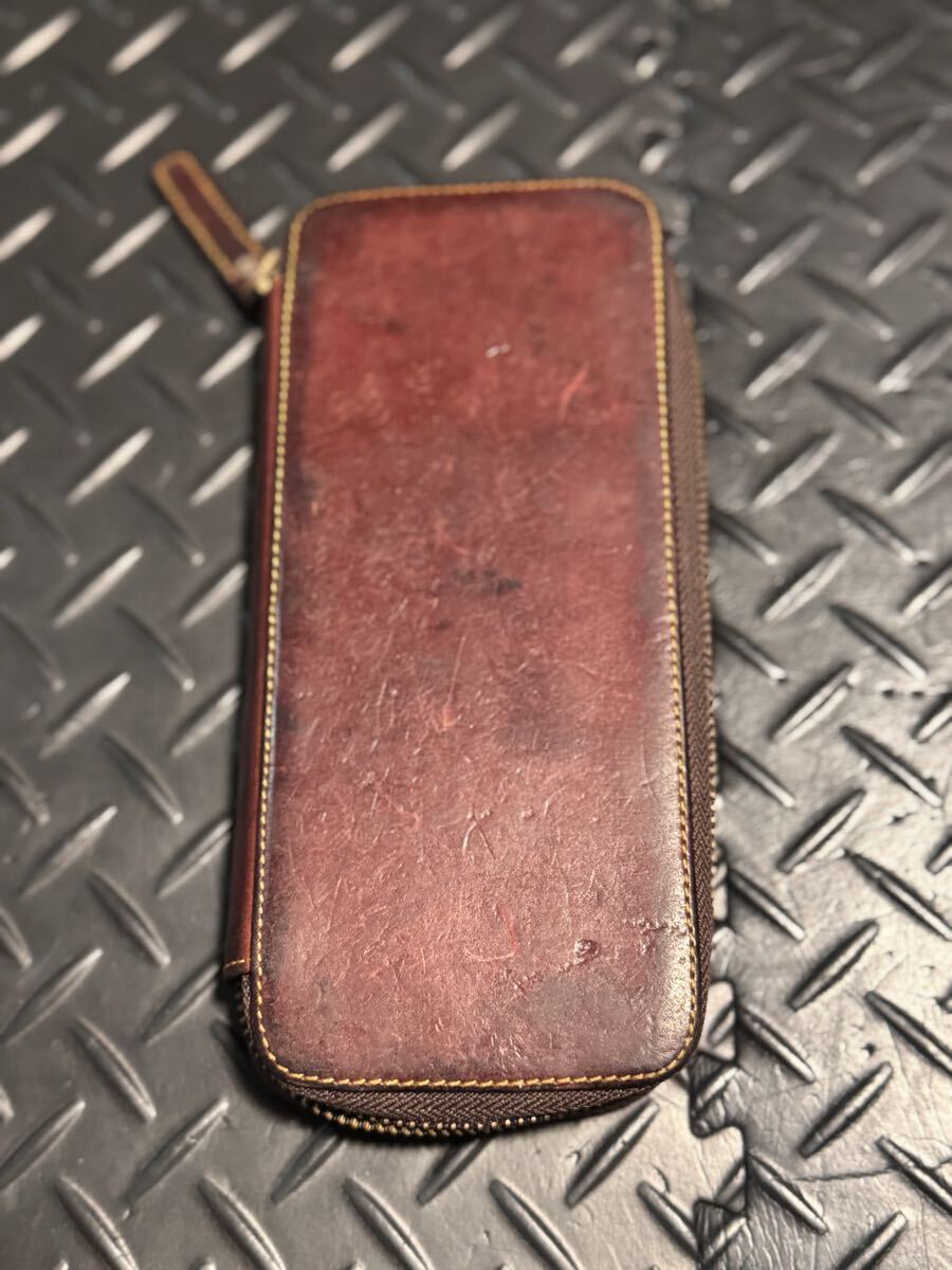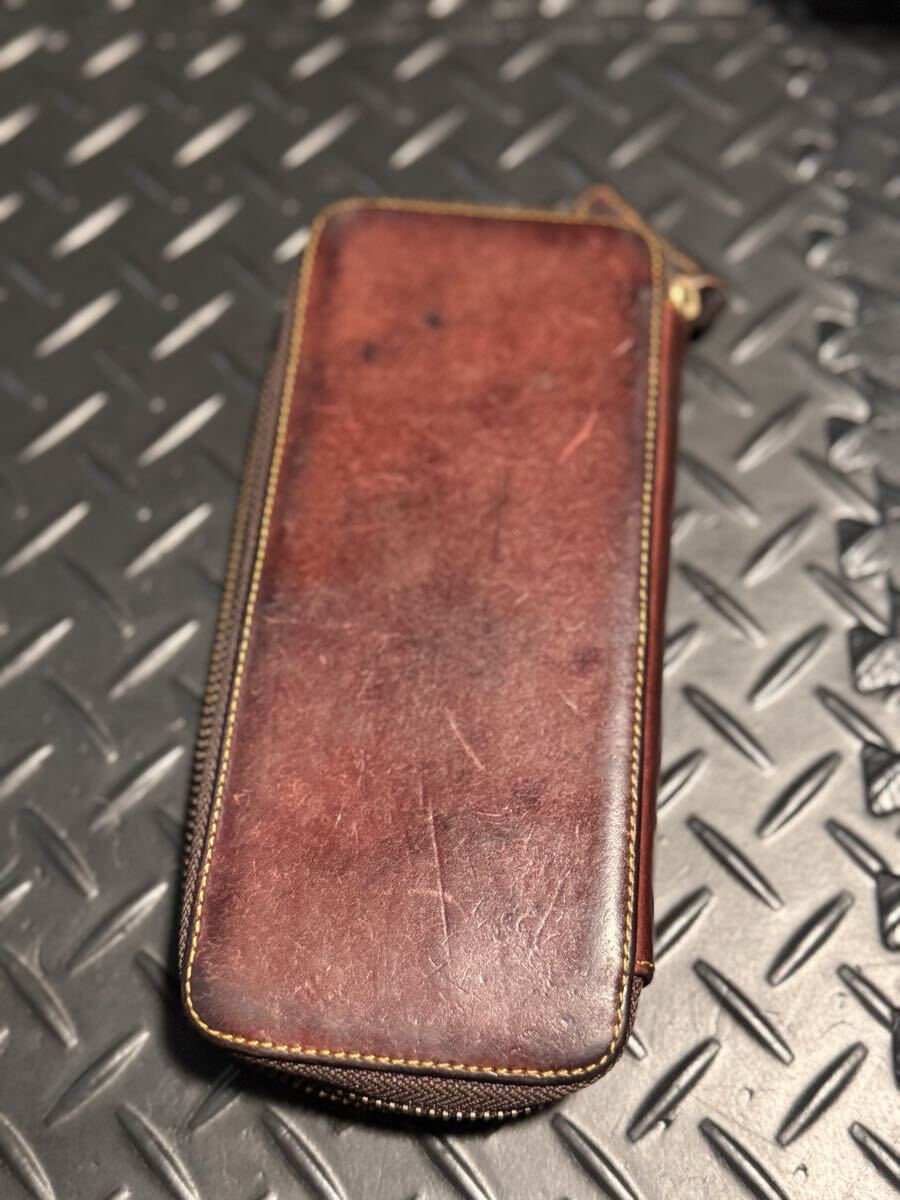 商品の状態は画像を参考にしてください。 【ブランド】 ・【Bahagia & craft/バハギア】 【商品名】 ・Bahagia & craft バハギア クラフト ラウンドジップ型ペンケース プエブロレザー モスト 【詳細】 ・外の革:プエブロ モスト(ワインレッド) ホルダー類:ブッテーロ マルーン 内張:カウスウェード ダークブラウン 牛本革(イタリアンレザー) 【サイズ】 ・長さ:約20cm 横:約8.5cm 定規は15cm程度の物が収納可能です 左側2つは、軸径約13㎜まで収納可能 右側2つは、軸径約15㎜まで収納可能 【商品説明】 ・ペンホルダーにより、整理整頓できペン同士の接触による傷付きが防止できます。 ・ペンホルダー上部のフラップにより、ペン取り出し時にファスナーとペンとの接触による傷付きを防止できます。 左側には、敢えて浅いポケットを準備し、備品の取り出し易くしています。 定規専用のポケットも準備し、整理整頓し易くしています。 ※定規以外のモノも収納可能です。